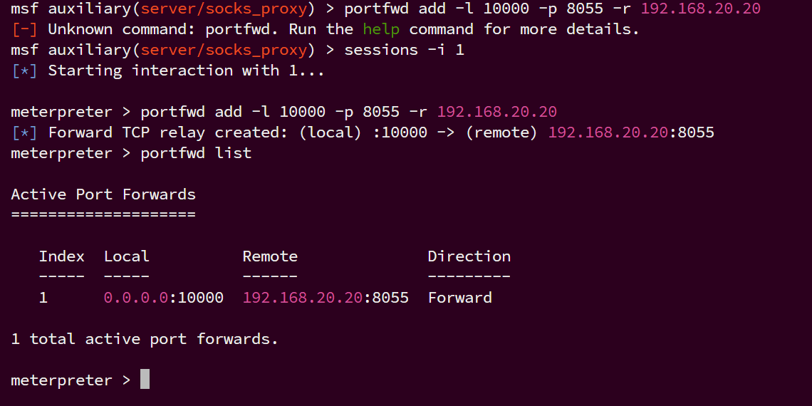 msf > portfwd add -l 10000 -p 8055 -r 192.168.20.20