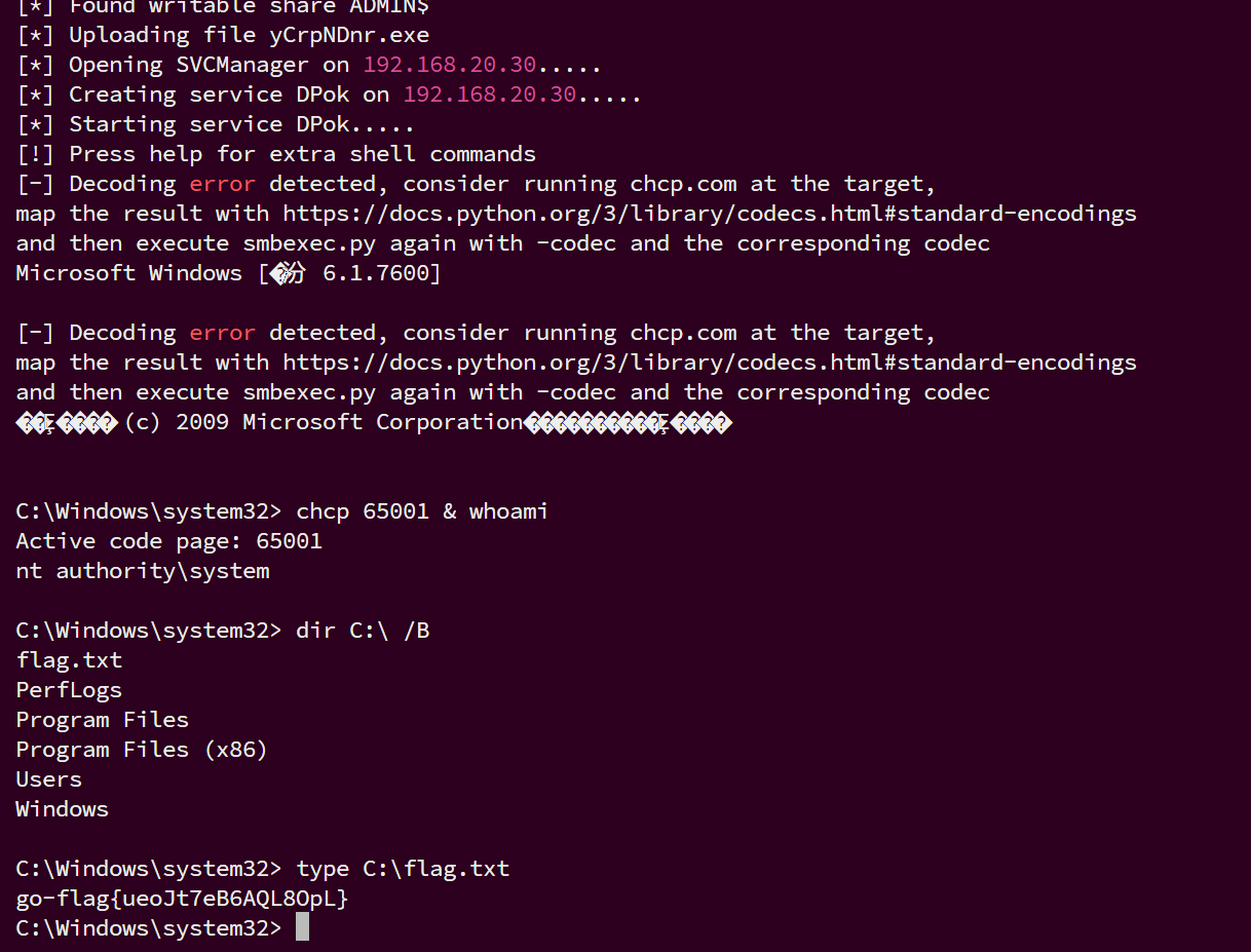 拿到域管理员哈希,使用域管理员哈希进行哈希传递,在20.30主机上使用psexec开一个system权限的shell, Windows 的服务默认是以 NT AUTHORITY\SYSTEM 账户运行的,使用PsExec开启一个shell服务,就可以拿到system