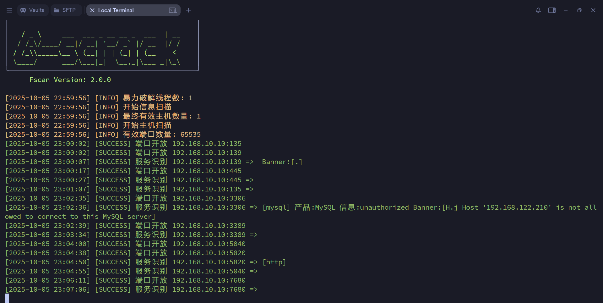 [2025-10-05 15:38:09] [HOST] 目标:192.168.20.10 状态:alive 详情:protocol=ICMP