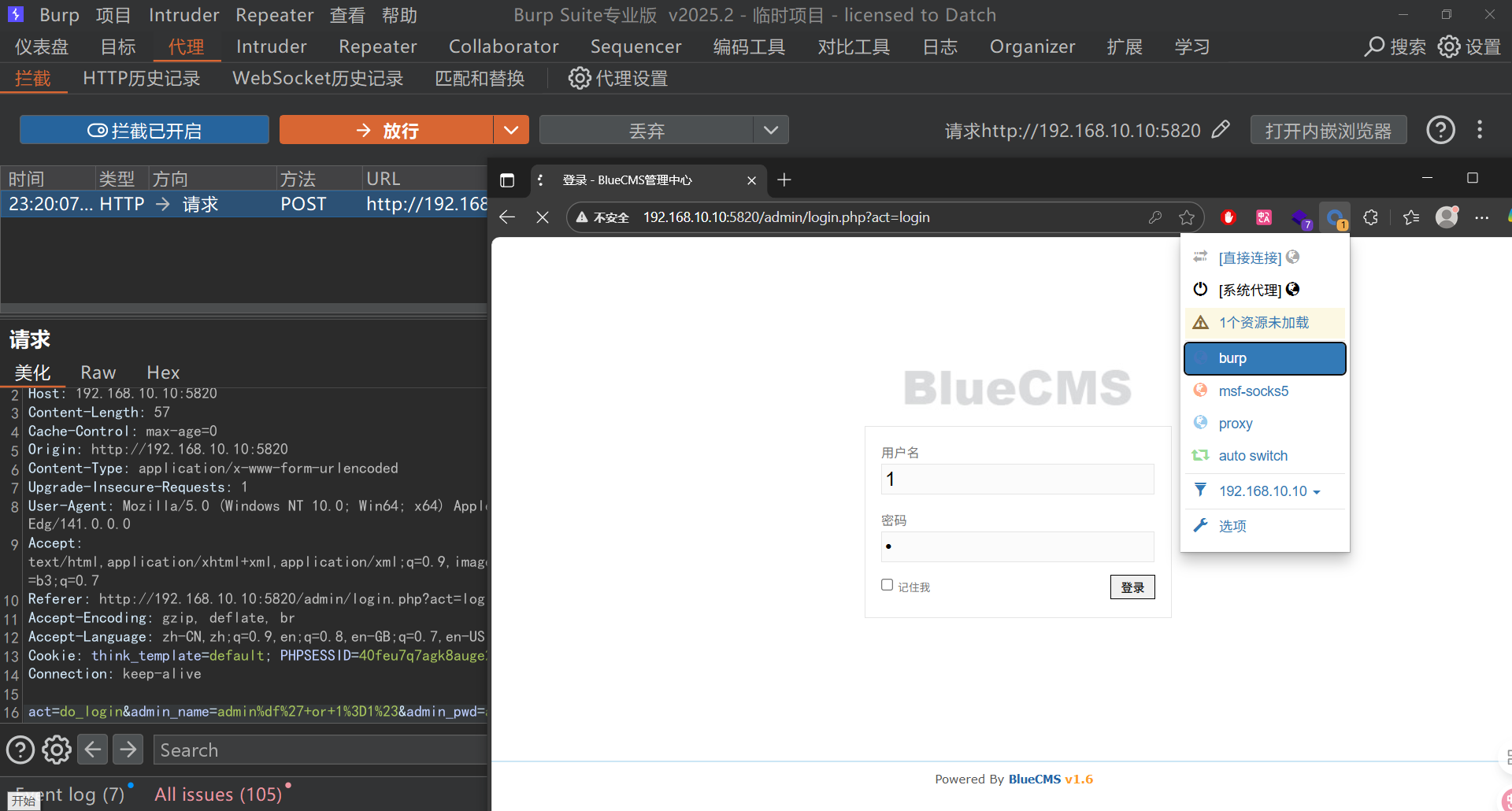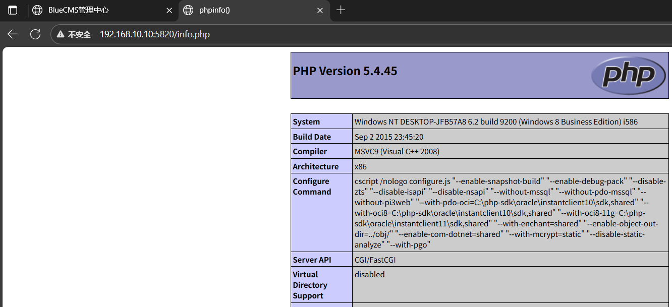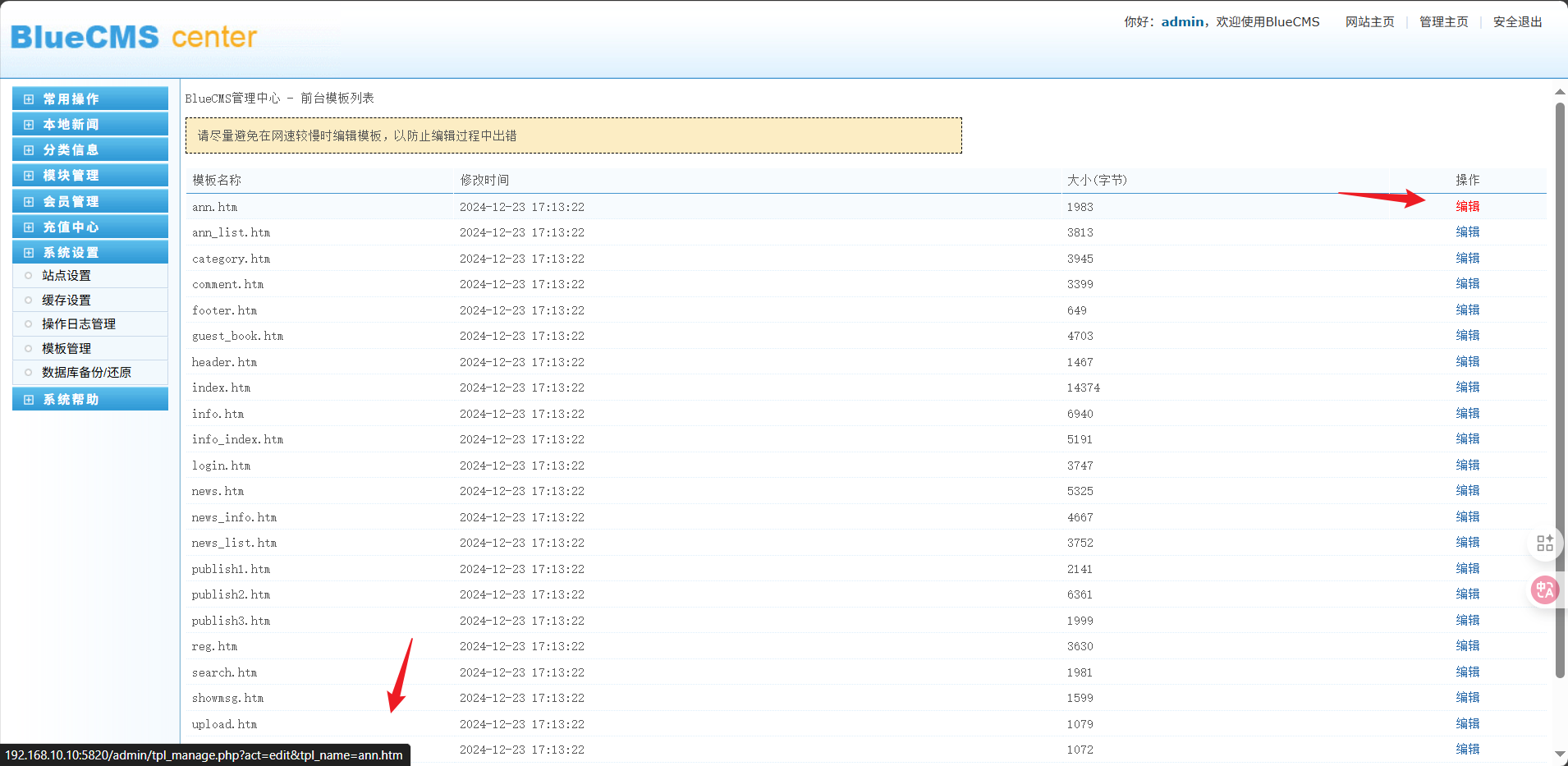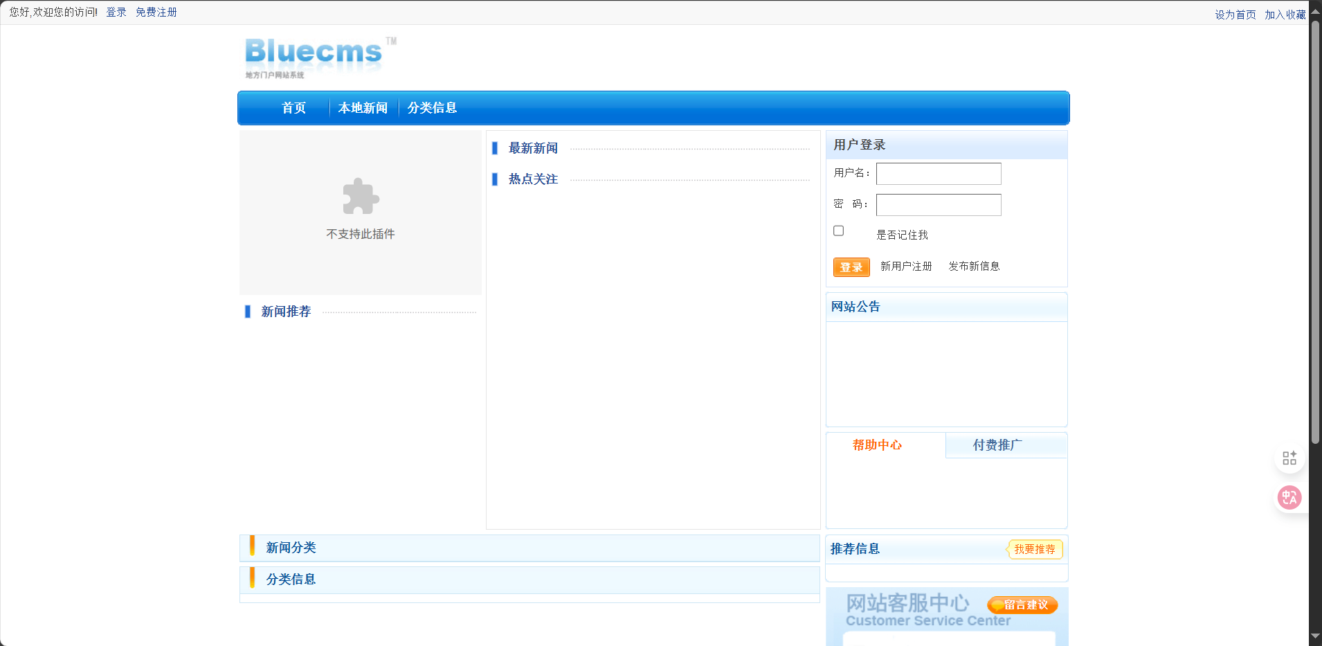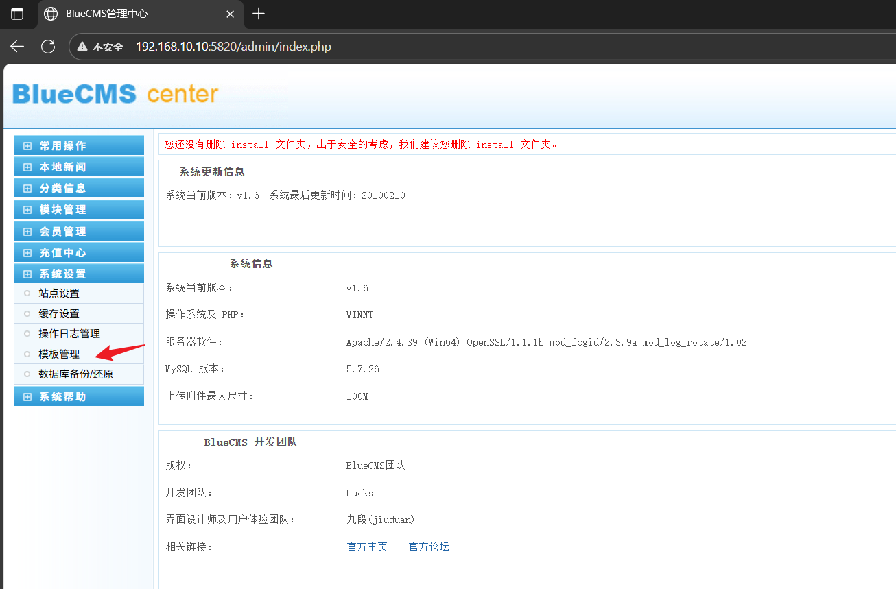 访问5820端口,Bluecms,比较逆天,这个cms的install功能没有关闭,甚至可以重装。找到一篇漏洞复现文章代码审计-bluecms (opens new window)