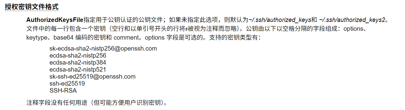 man 手册https://man.openbsd.org/sshd (opens new window)中关于 authorized_keys 的描述: