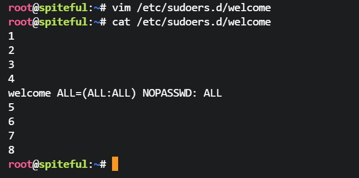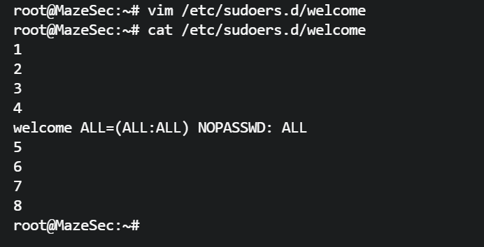 测试:在 Debian 测试环境下,把恶意 sudoers 配置写入 /etc/sudoers.d/welcome 文件中