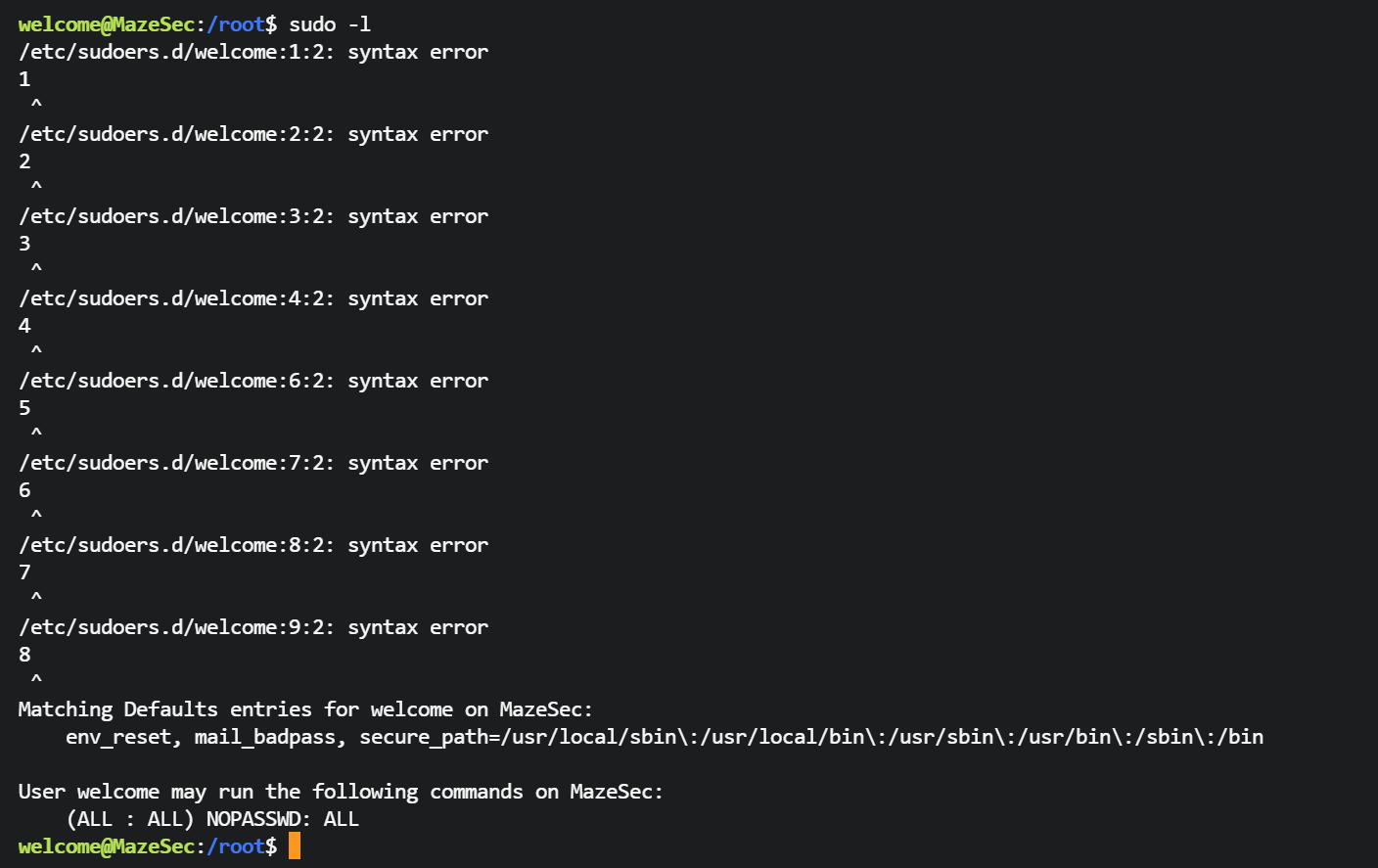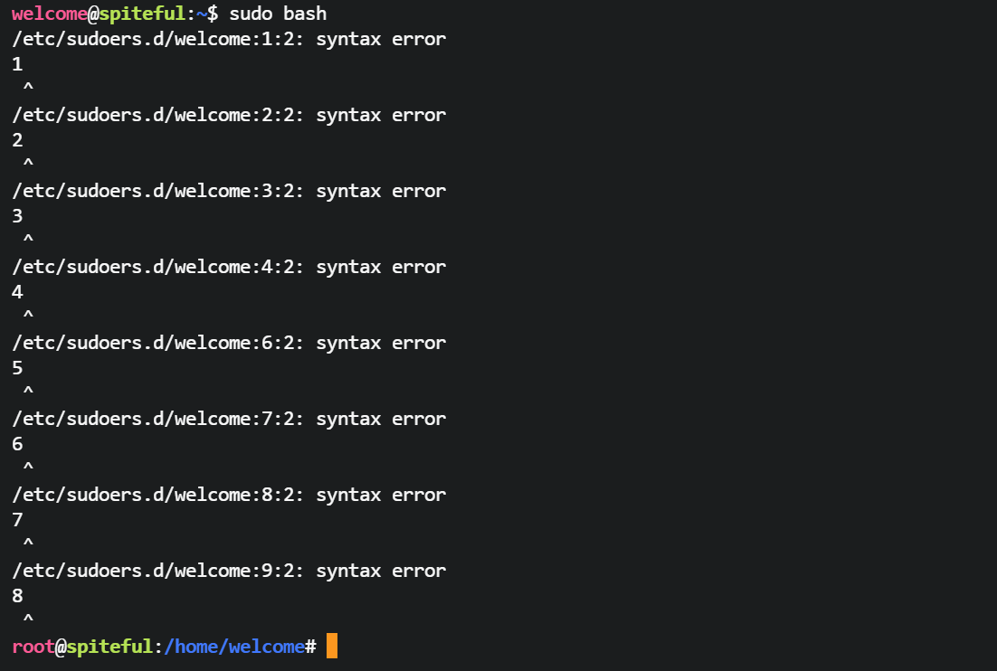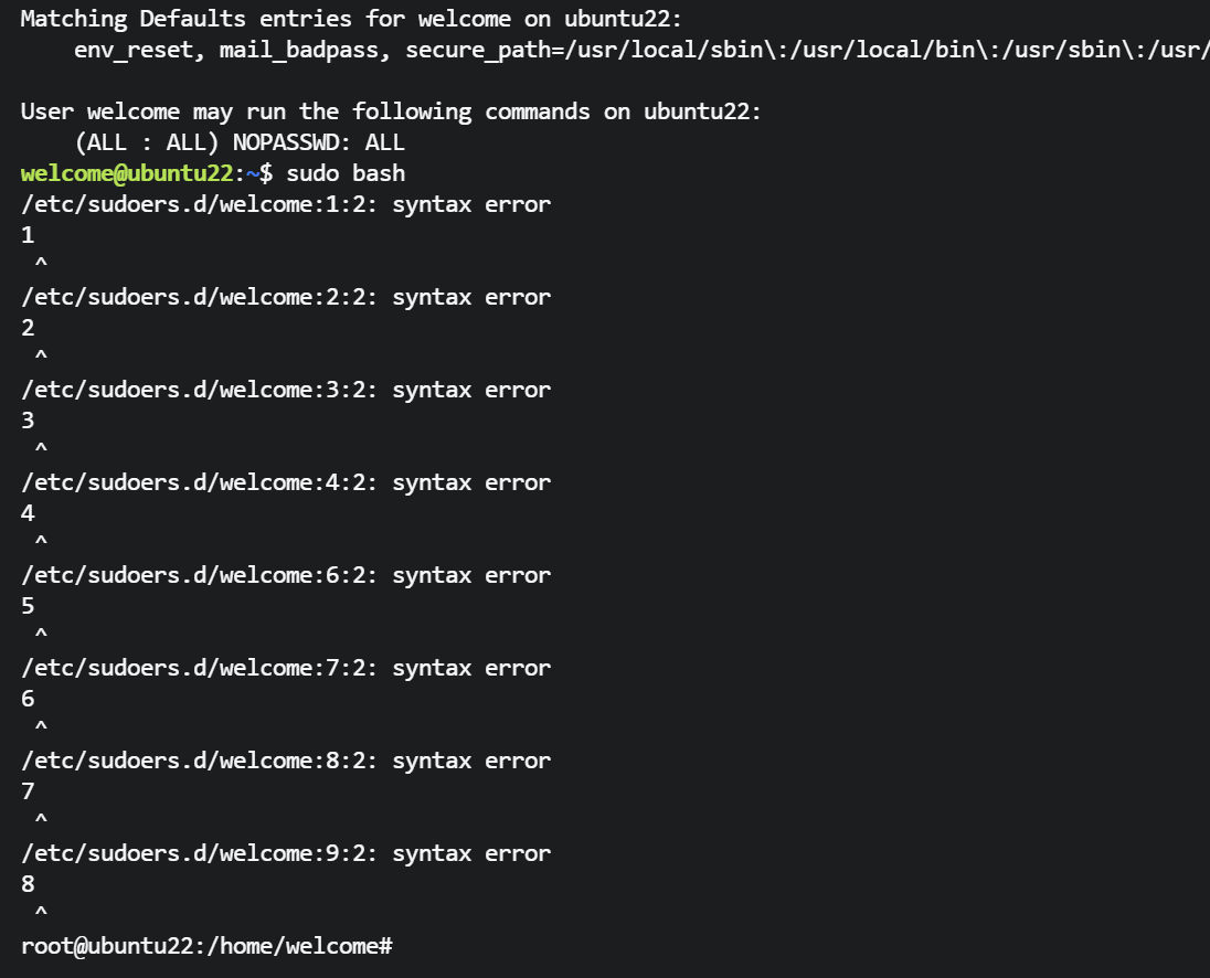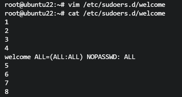 测试:在 Ubuntu 测试环境下,把恶意 sudoers 配置写入 /etc/sudoers.d/welcome 文件中