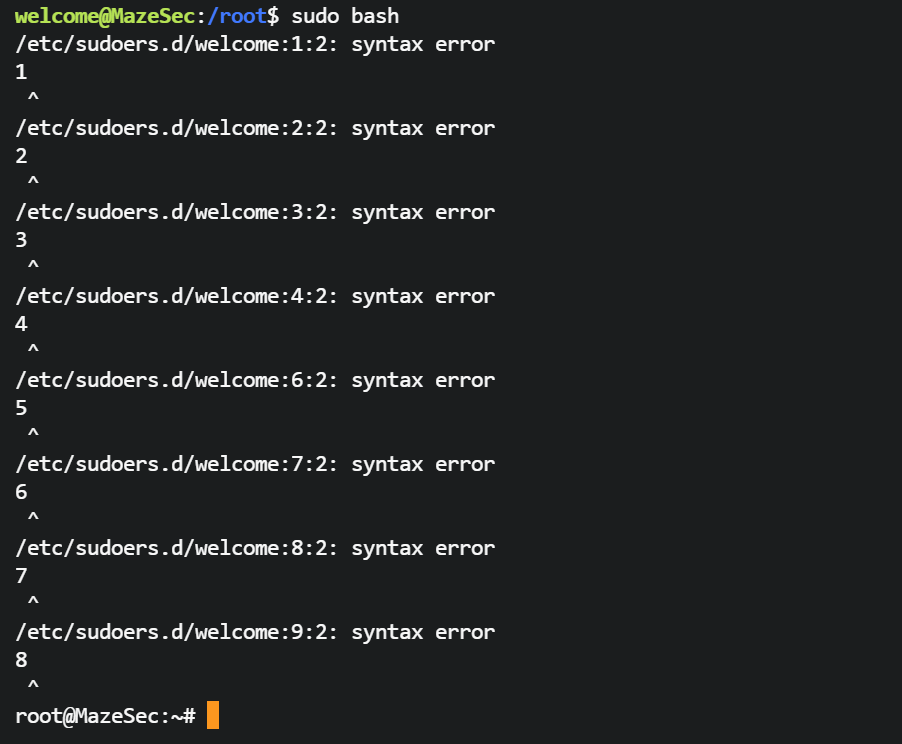 利用理由:sudoers 解析器在读取配置时会跳过语法错误的行,并继续解析后续合法配置行。这种“跳过错误行”的机制,使我们只需成功写入一行格式正确的恶意配置,就能在不破坏原有配置的前提下实现权限提升。