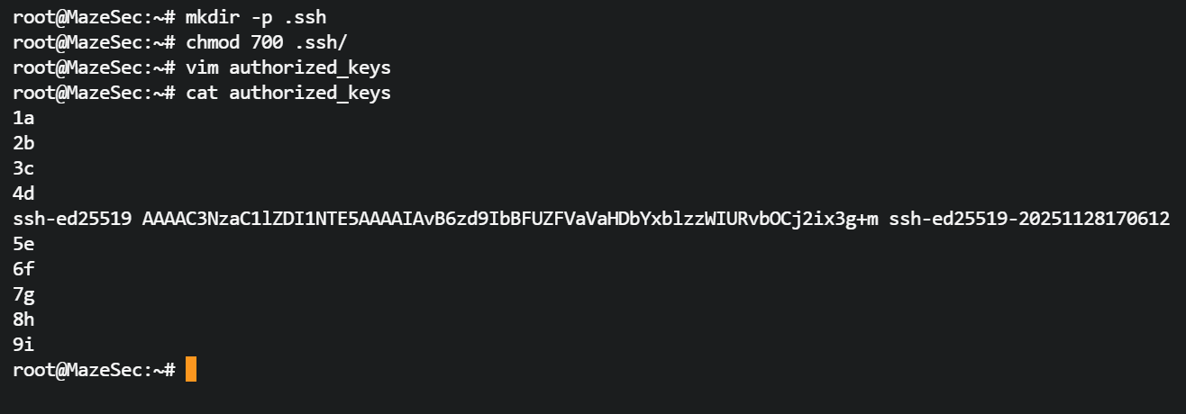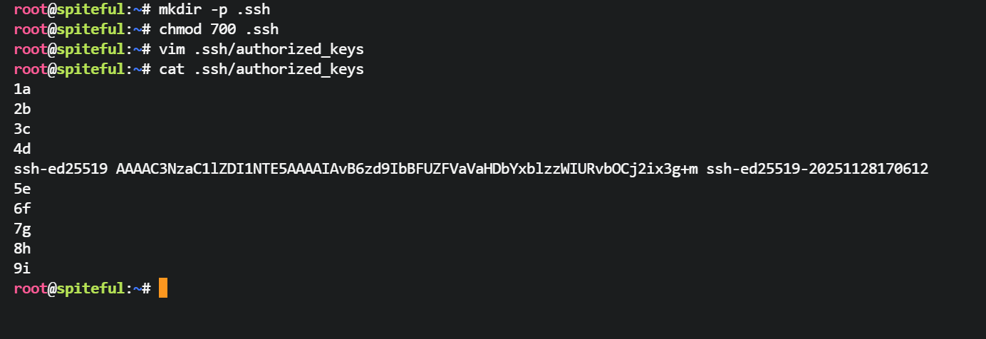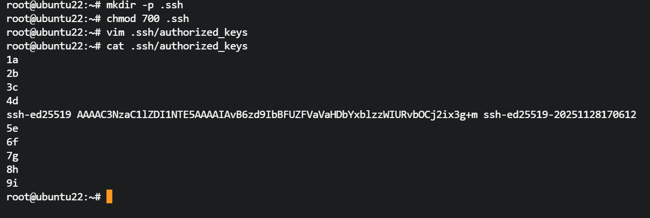 选择理由:authorized_keys 会将文件中的每一行解析为一条独立的公钥(空行和以 # 开头的注释行除外),只要整行语法合法就会被 sshd 接受并参与认证匹配。这种“逐行独立解析”的机制,使我们只需成功写入一行格式正确的公钥,就能在不破坏原有配置的前提下实现权限提升。