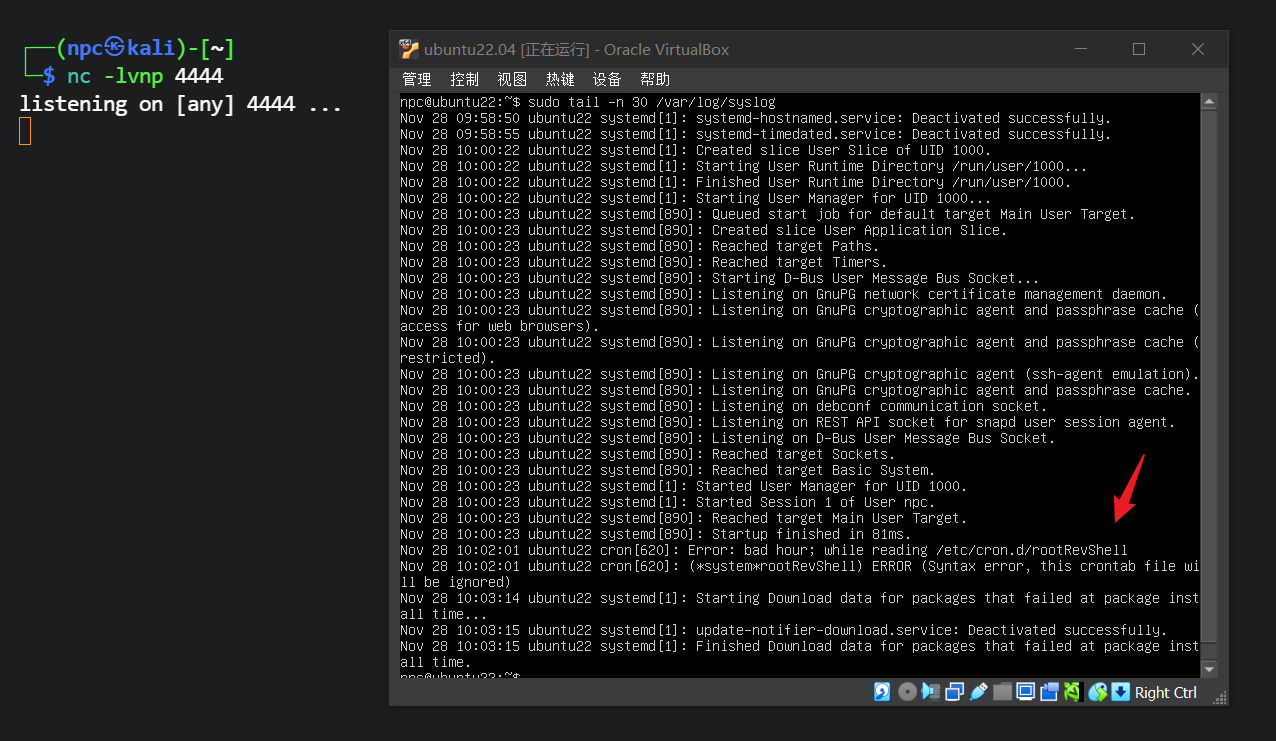 本地 Kali 尝试写入定时任务测试,同样因语法错误,整个定时任务文件被忽略