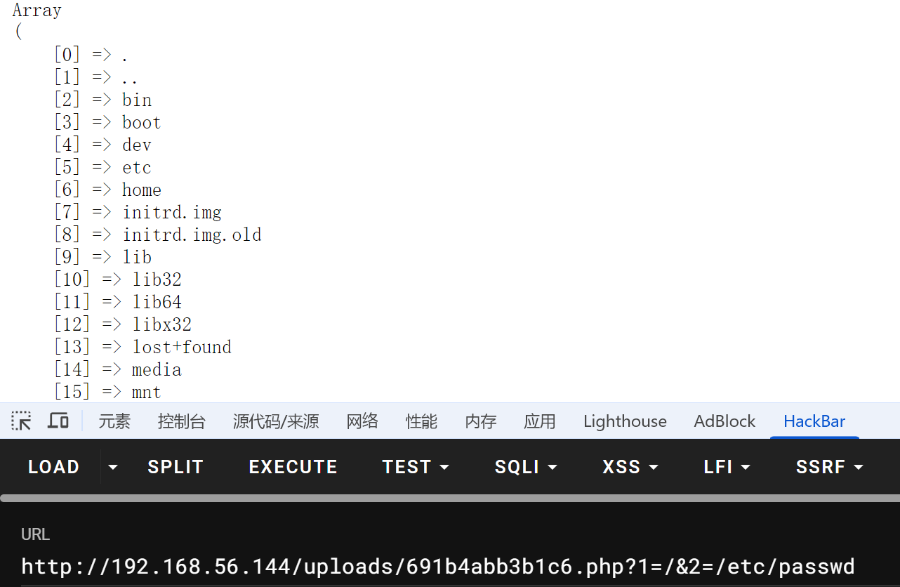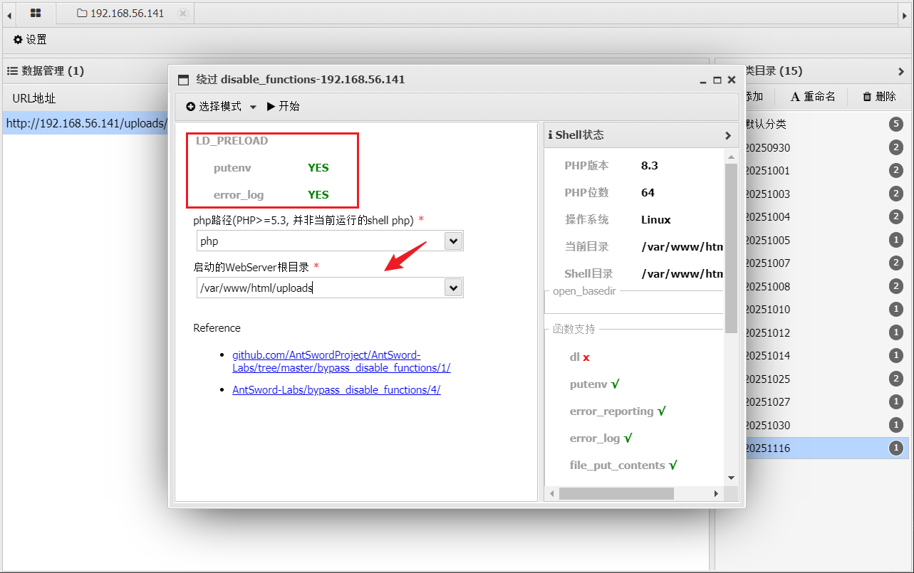 检测到 putenv、error_log 可用(info.php的phpinfo页面也可以发现),选择当前webshell所在路径 /var/www/html/uploads/,绕过