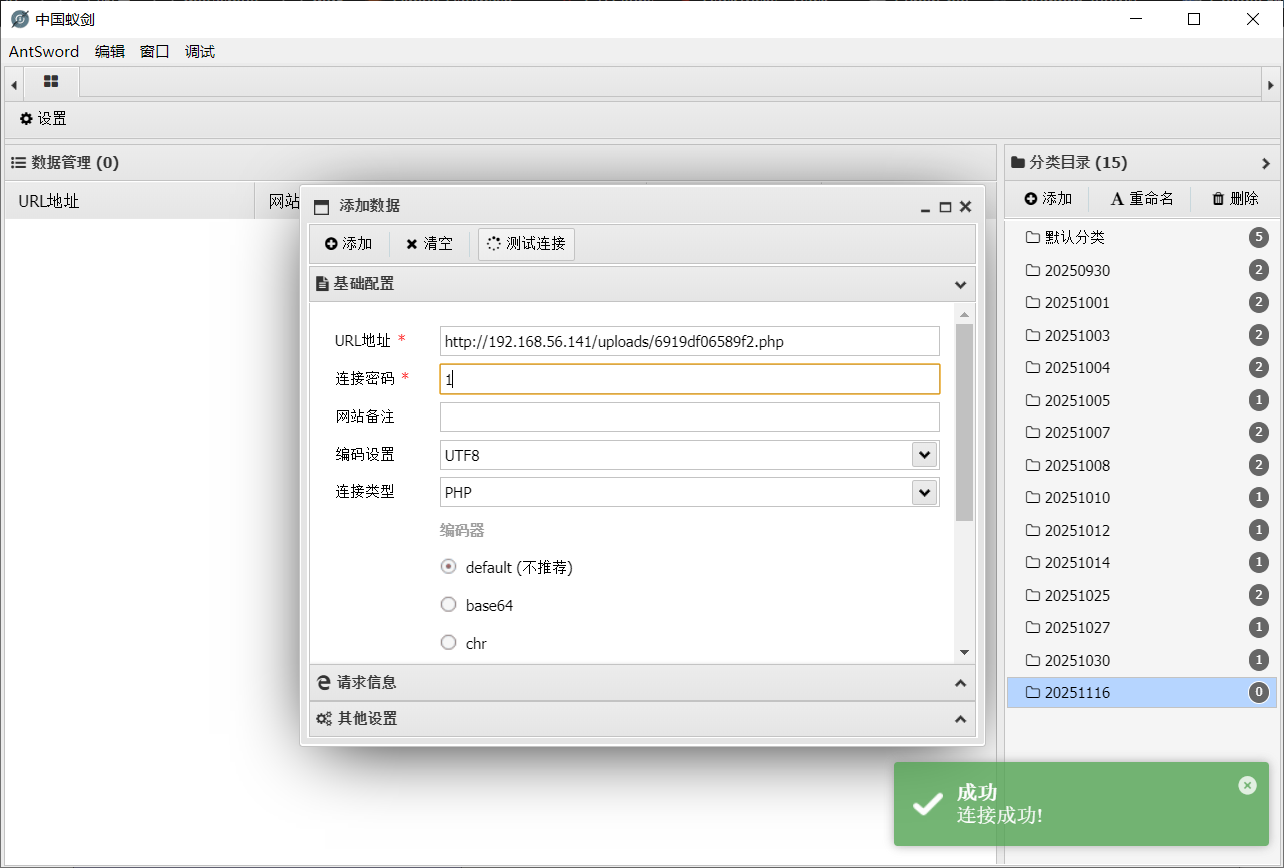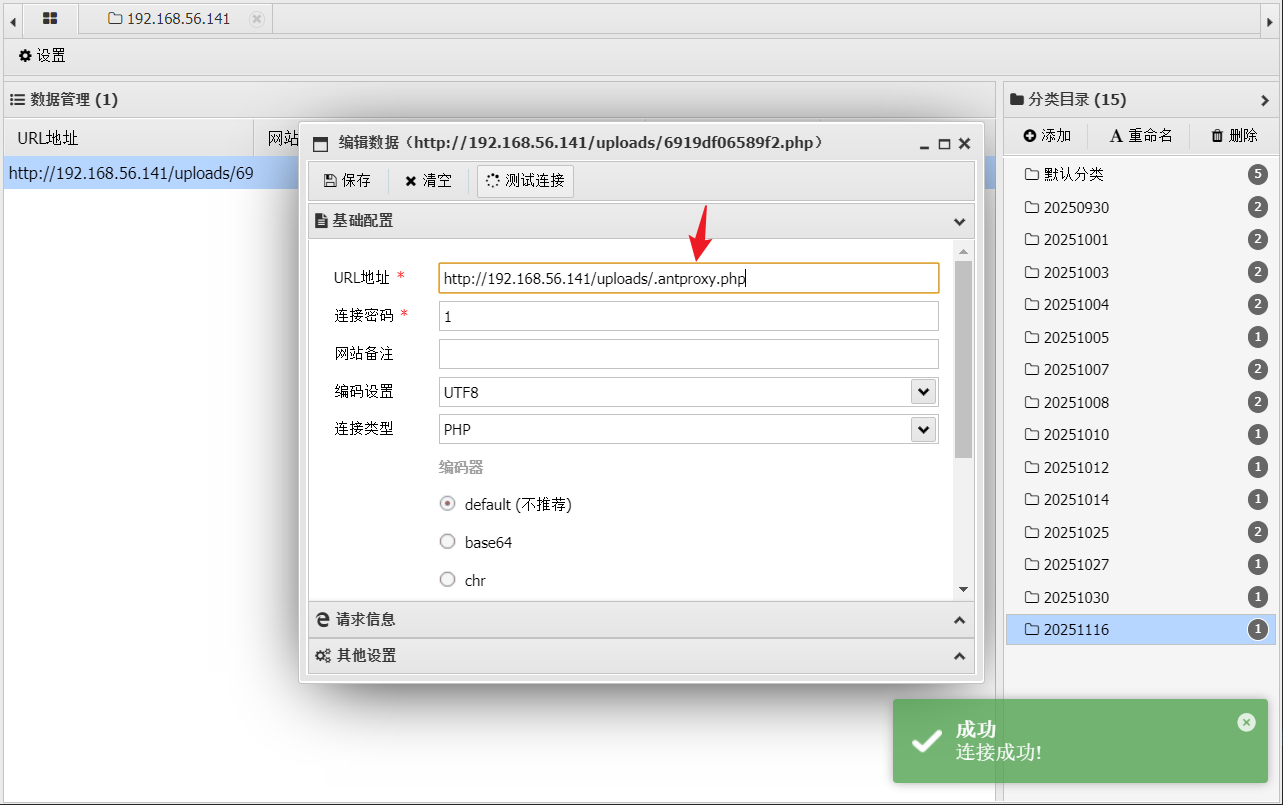 新建一个webshell连接,文件名使用 .antproxy,密码还是刚刚上传的webshell密码