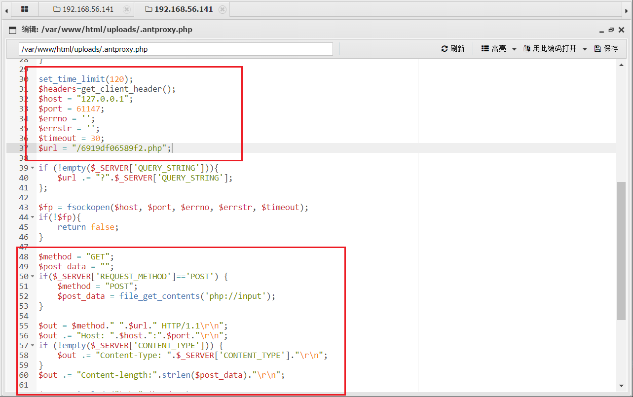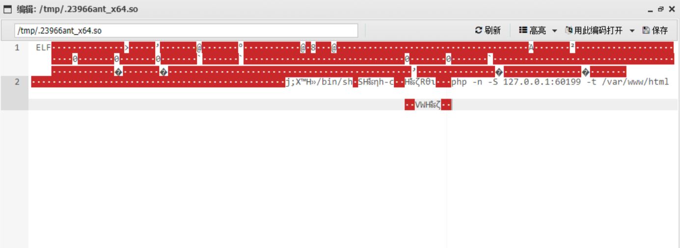 分析上传的恶意动态链接库文件,通过可见字符可以知道,这会使用php内置的web服务器监听在127.0.0.1:61147端口,web根目录设置为 /var/www/html,然后我们可以通过 生成的 .antproxy.php 与这个内置web服务器通信,实现命令执行