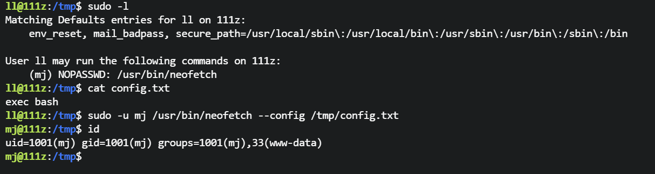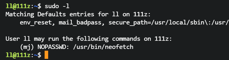 sudo 权限枚举,发现ll用户可以无密码以 mj 用户身份运行 neofetch