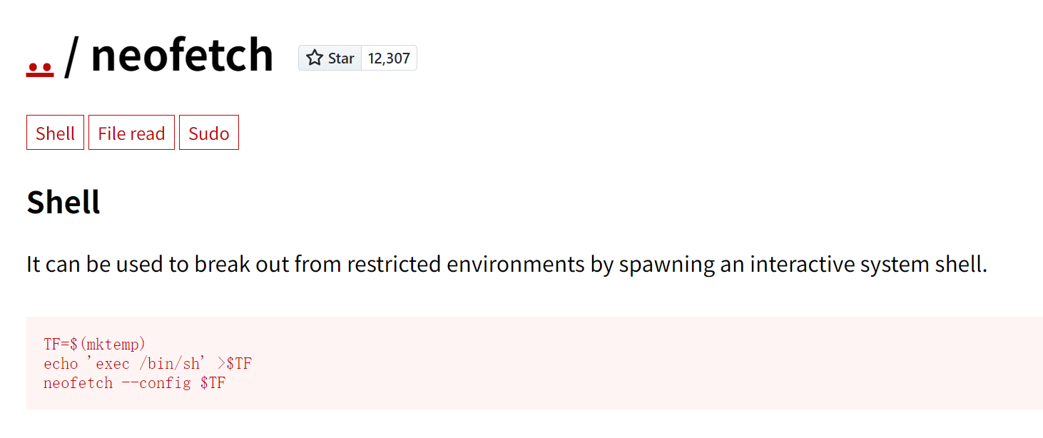 gtfobins 里发现 neofetch 可以被滥用来提权,https://gtfobins.github.io/gtfobins/neofetch/ (opens new window)