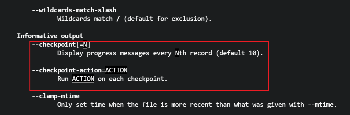 使用man 命令查看 tar 的帮助,找到存在参数--checkpoint-action=exec=COMMAND,可以在每个检查点执行指定命令,需要有一个检查点才行,使用--checkpoint=N参数可以指定每N个个检查点执行一次