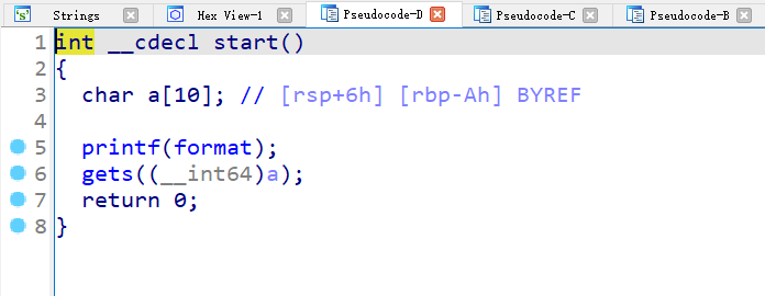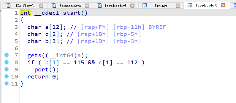 start函数,调用了gets函数(事故多发点),符合条件时会调用port函数