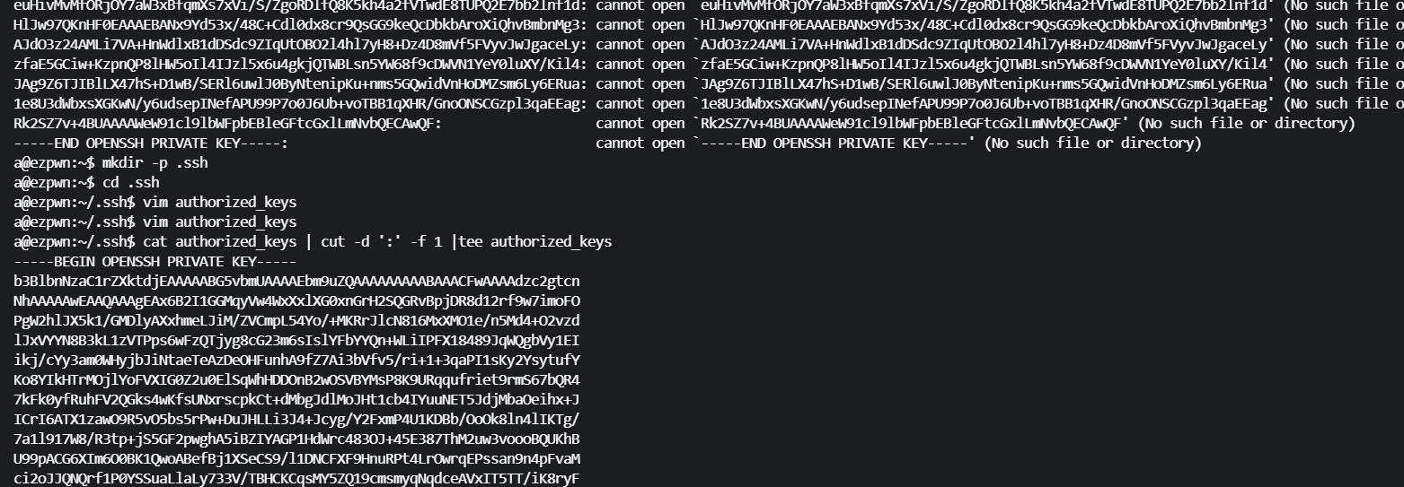 a@ezpwn:~/.ssh$ cat authorized_keys | cut -d ':' -f 1 |tee authorized_keys