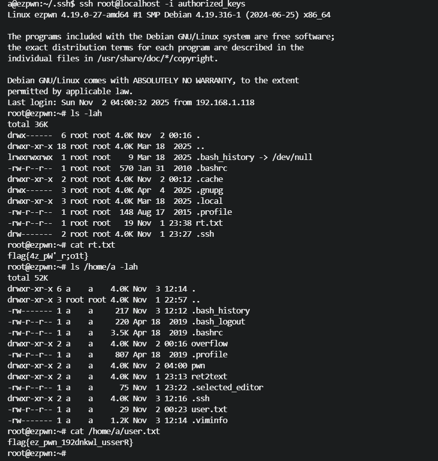 a@ezpwn:~/.ssh$ chmod 600 authorized_keys