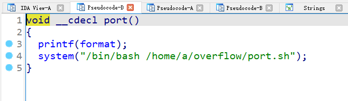 port函数,调用了system函数,执行了一个port相关脚本/home/a/overflow/port.sh,同时说明了存在用户a
