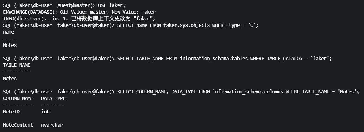 INFO(db-server): Line 1: 已将数据库上下文更改为 "faker"。