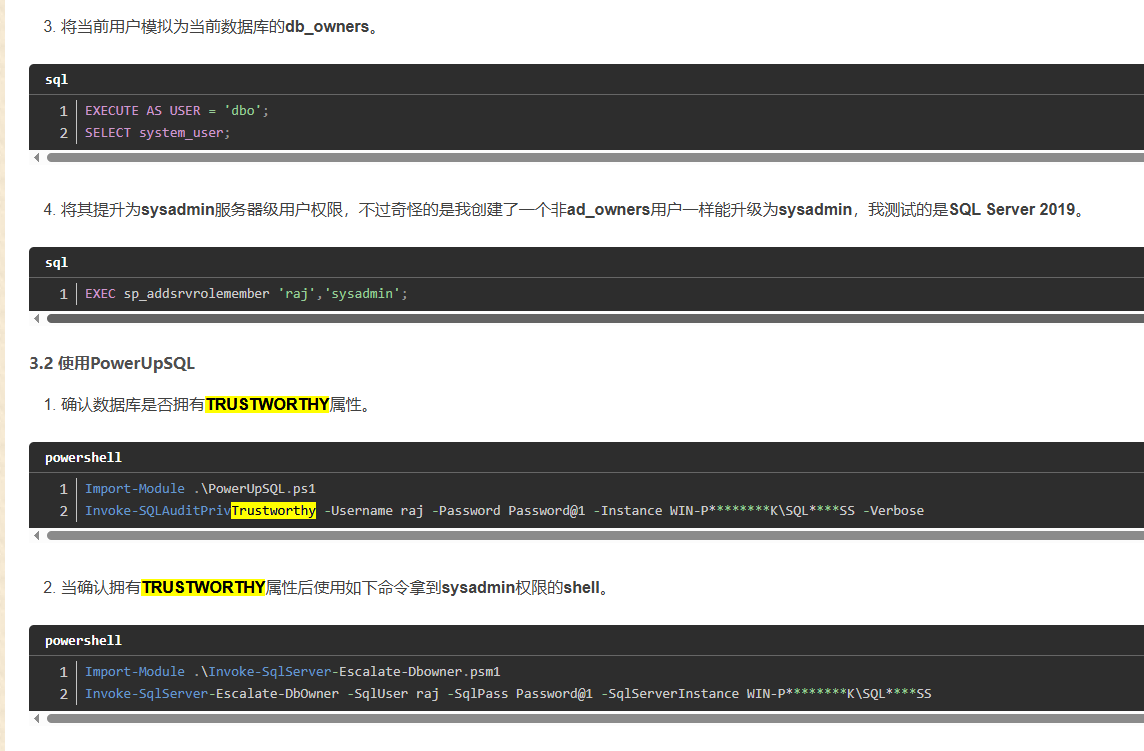 提示开启了TRUSTWORTHY,搜下mssql相关文章MSSQL渗透备忘录 (opens new window)