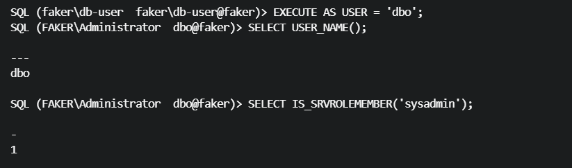 SQL (faker\db-user faker\db-user@faker)> EXECUTE AS USER = 'dbo';