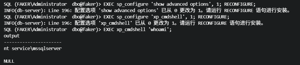 SQL (FAKER\Administrator dbo@faker)> EXEC sp_configure 'xp_cmdshell', 1; RECONFIGURE;