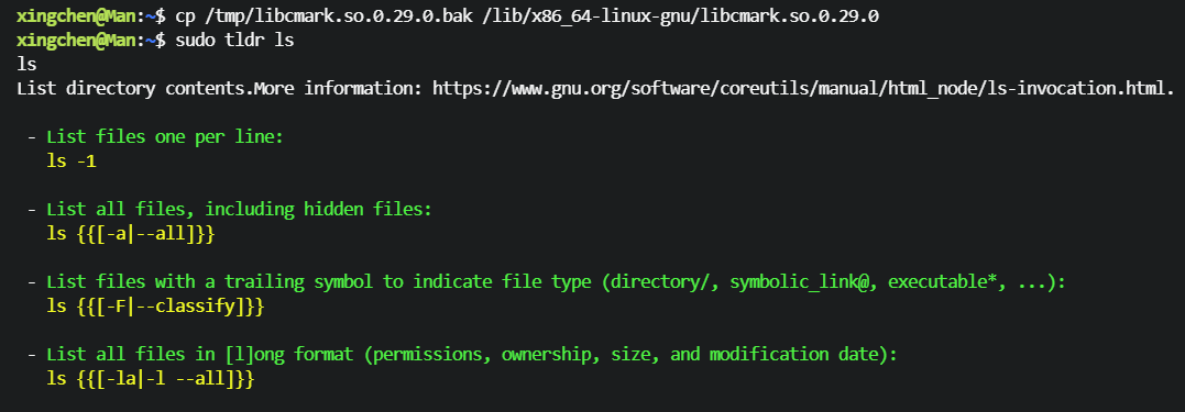 xingchen@Man:~$ cp /tmp/libcmark.so.0.29.0.bak /lib/x86_64-linux-gnu/libcmark.so.0.29.0