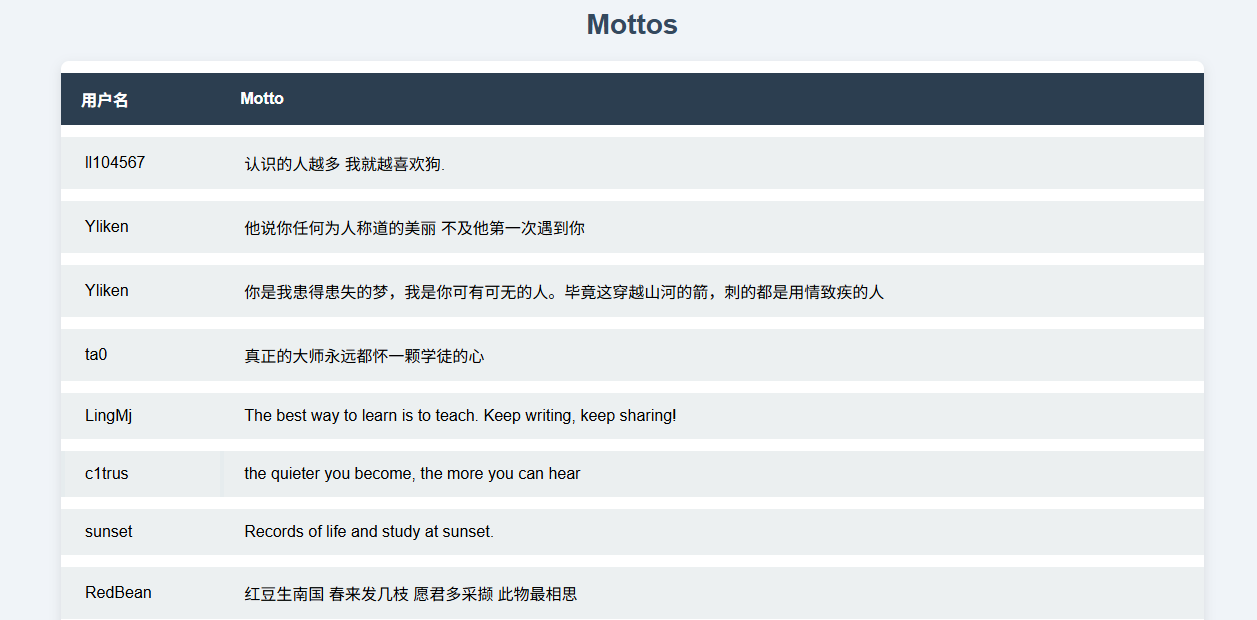 在 /myinfo 修改昵称为 'or 1='1 后,到 /mymottos 页面发现出现所有用户的 motto,推测存在二阶 SQL 注入(源头在个人信息保存,生效点在座右铭查询)。