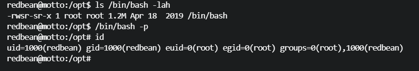 uid=1000(redbean) gid=1000(redbean) euid=0(root) egid=0(root) groups=0(root),1000(redbean)