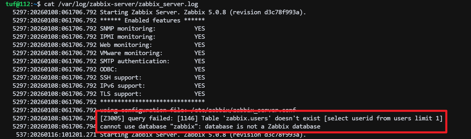 5297:20260108:061706.794 [Z3005] query failed: [1146] Table 'zabbix.users' doesn't exist [select userid from users limit 1]