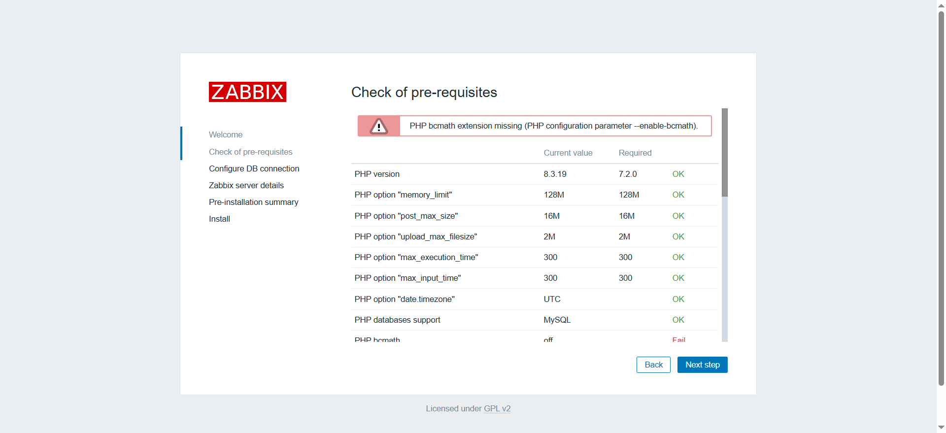 访问靶机 8000 端口,进入 zabbix 部署页面,检查环境依赖遇到很多问题,有些要求php.ini配置修改,有些要求php模块安装