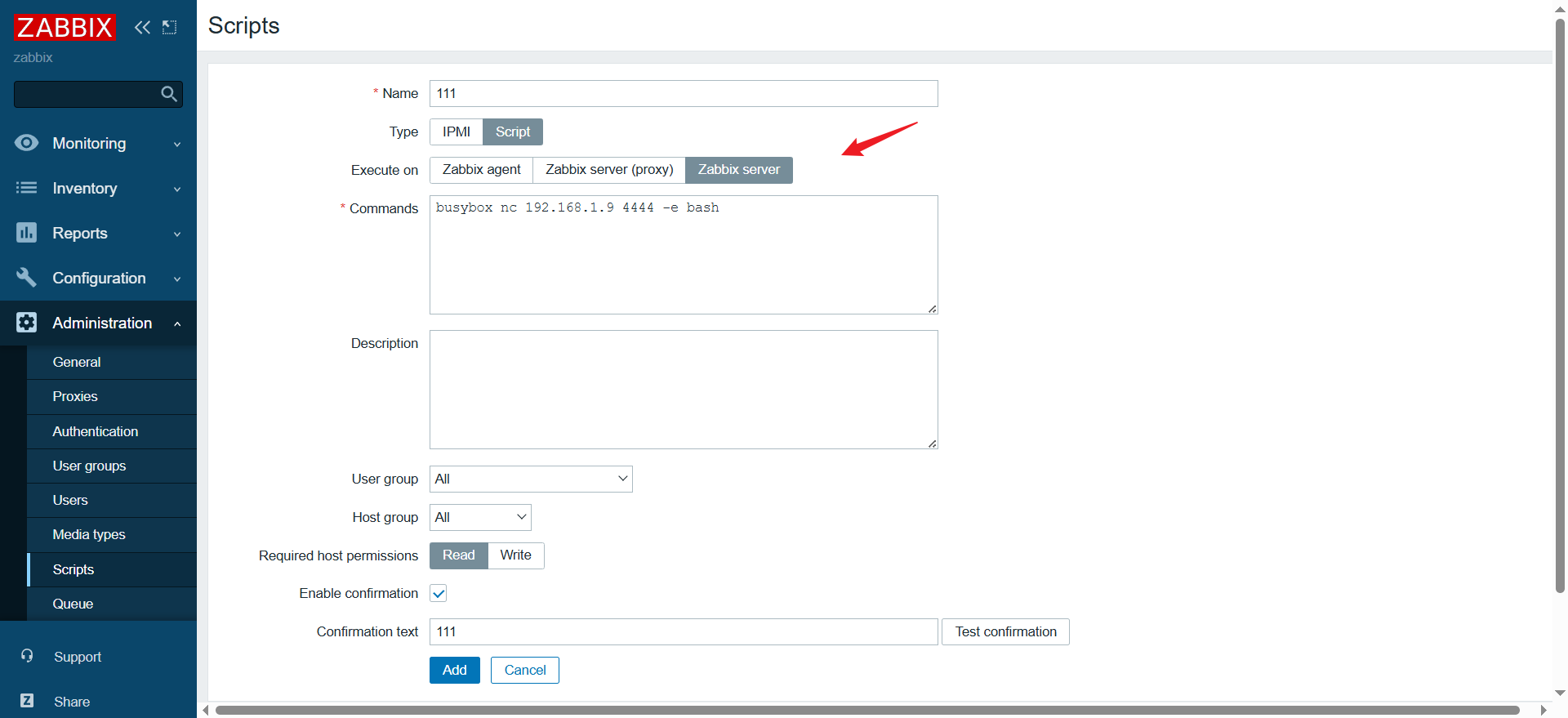 在 zabbix 后台添加一个 反弹 shell 脚本