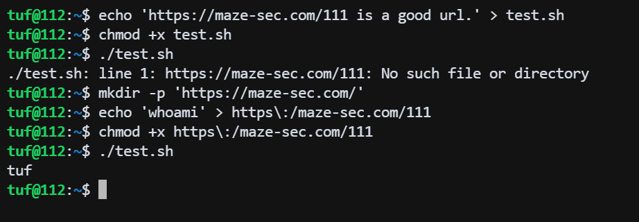 tuf@112:~$ echo 'https://maze-sec.com/111 is a good url.' > test.sh